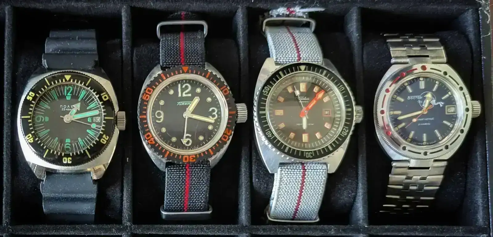 Foto de familia de mi arrejunte de divers soviéticos. El Poljot es el último en llegar (y necesita pasar por boxes 😩)