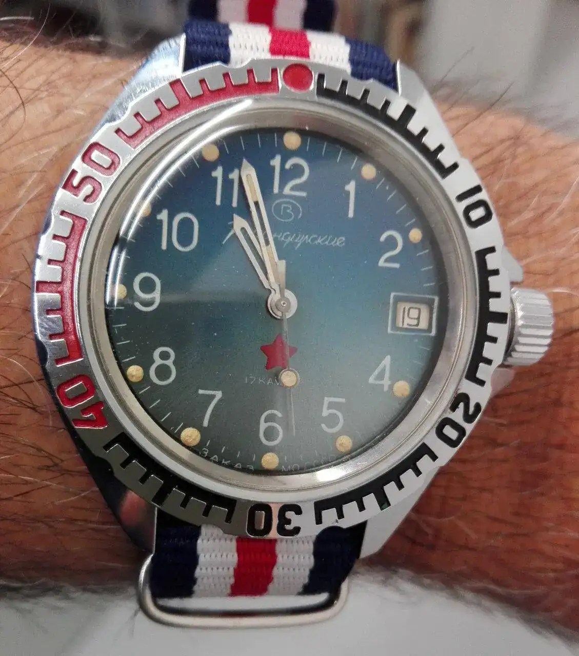 Pues yo lo veo todo original, la esfera es ZAKAZ y en un estado de revista. Solo las agujas tienen esa falta de lumen que, o se lo pones o ya le quitas los restos que quedan. Es un modelo muy bonito de Komandirskie y esa nato que le has puesto le queda simplemente perfectaHoy luzco soviético que, por lo que me costó, tiene toda la pinta de ser una reconstrucción (si no un franken). Tengo que ponerme con el fechador y repintar las agujas, pero la esfera luce bonita (no recoge bien la foto su brillo)