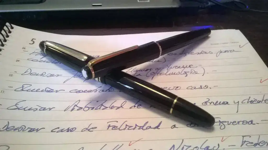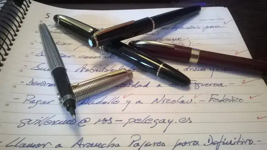 En esta foto, de arriba a abajo: modelo de celuloide de los 50; modelo transicional de los 60, y modelo posterior a 1973 con plumín monocolor.