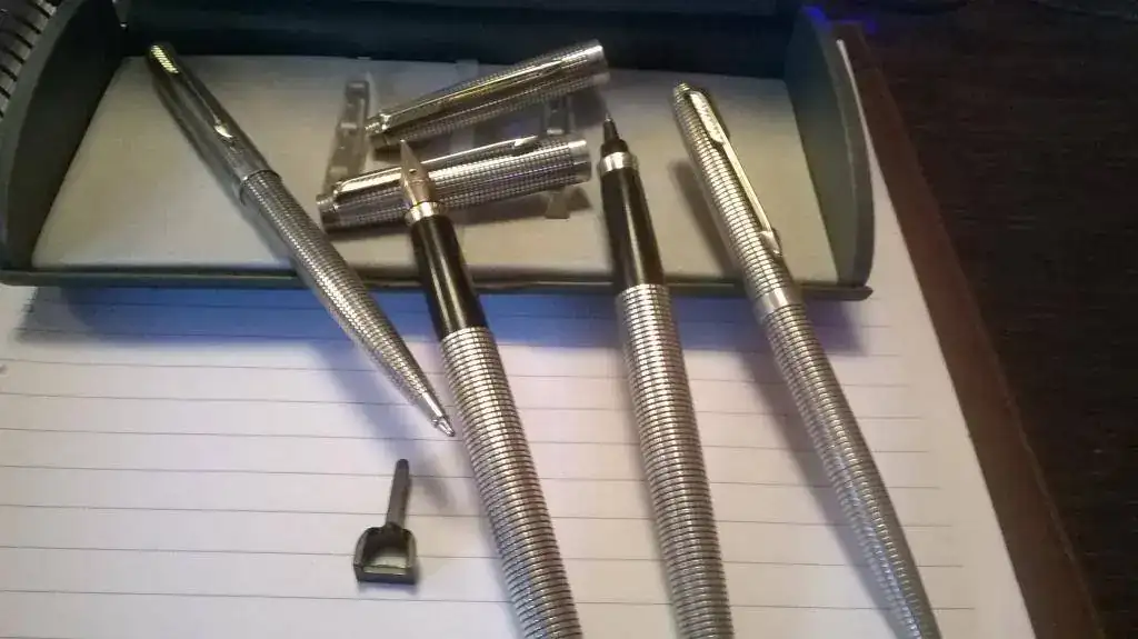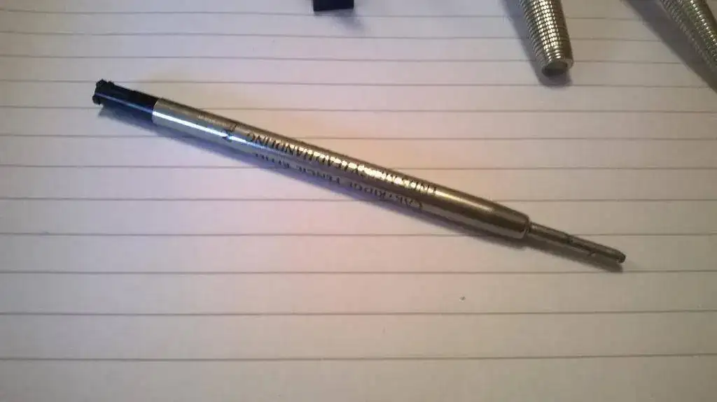 solitaire) y las fabricadas para el mercado francés, que llevan uno de 18K. Hay diferencias también en el extremo de las secciones de agarre, en la forma de los clips y el roscado del pistón, en unas con roscas plásticas y otras de latón, pero no es del todo consistente, pudiéndose encontrar unidades con estas características mezcladas. Hay que tener en cuenta que, además, aunque se hubiera producido un cambio de especificaciones, podían mezclar piezas hasta agotar