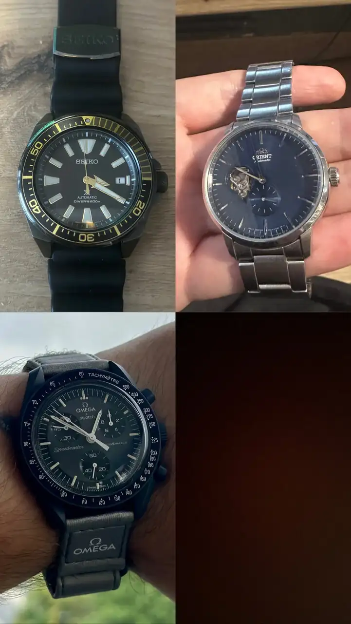 Estos 3 son los que he acabado vendiendo, el Seiko no me termino de convencer la correa de goma que traía y el color negro, me cansó y lo vendí para ahorrar para otra pieza, el Orient no me termino de encajar con mi forma de vestir, y el Moonswatch lo compré porque me encantaba pero no sabía que no se podía reparar si le pasaba algo, errores de novato… lo vendí al enterarme.