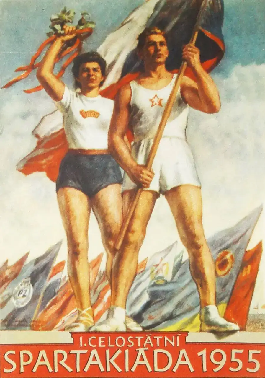 Cartel de la Espartaquiada Nacional celebrada en 1955 en el Gran Estadio Strahov, en la que participaron más de un millón de atletas. (Fuente: https://www.metro.cz/praha/prvni-sp...ne-pred-60-lety.A150623_174216_co-se-deje_pur)