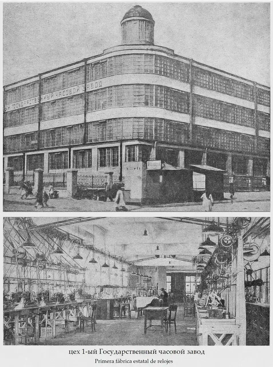 Edificio principal de la Primera Fábrica Estatal de Relojes de Moscú. En la imagen inferior, detalle de uno de sus talleres. (Fuente: https://www.oldserdobsk.ru/1000/071/1071013.html)