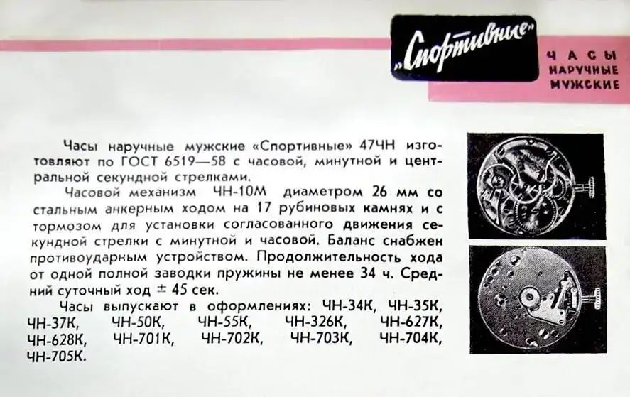 Anuncio del reloj en una revista de la época. Traducción adaptada a la lengua de Cervantes: El reloj de pulsera para hombre "Sportivnie" 47CHN está fabricado de conformidad GOST 6519-58 con agujas de horas, minutos y segundero central. En la imagen derecha, se observa el mecanismo CHN-10M del reloj. Presenta 26 mm de diámetro con un escape de áncora de acero y 17 rubíes, junto con un freno para ajustar el movimiento coordinado del segundero con las agujas de minutos y horas. El volante está equipado con un dispositivo anti-choque. La duración del movimiento tras darle cuerda completa al muelle no es inferior a 34 horas. La desviación diaria media es de ±45 segundos. Los relojes se fabrican en los siguientes diseños: CHN-34K, CHN-35K, CHN-37K, CHN-50K, CHN-55K, CHN-326K, CHN-627K, CHN-628K, CHN-701K, CHN-702K, CHN-703K, CHN-705K. CHN-704K. (Fuente: https://www.safonagastrocrono.club/sportivnie-what-a-wonderful-era/)