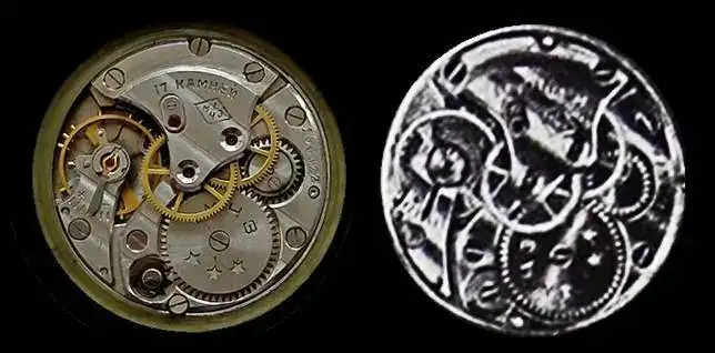 Imagen comparativa entre el calibre anunciado en el recorte de la revista anterior y el de mi Sportivnie. La estructura y disposición del movimiento es prácticamente idéntica. (Fuente: Montaje propio)