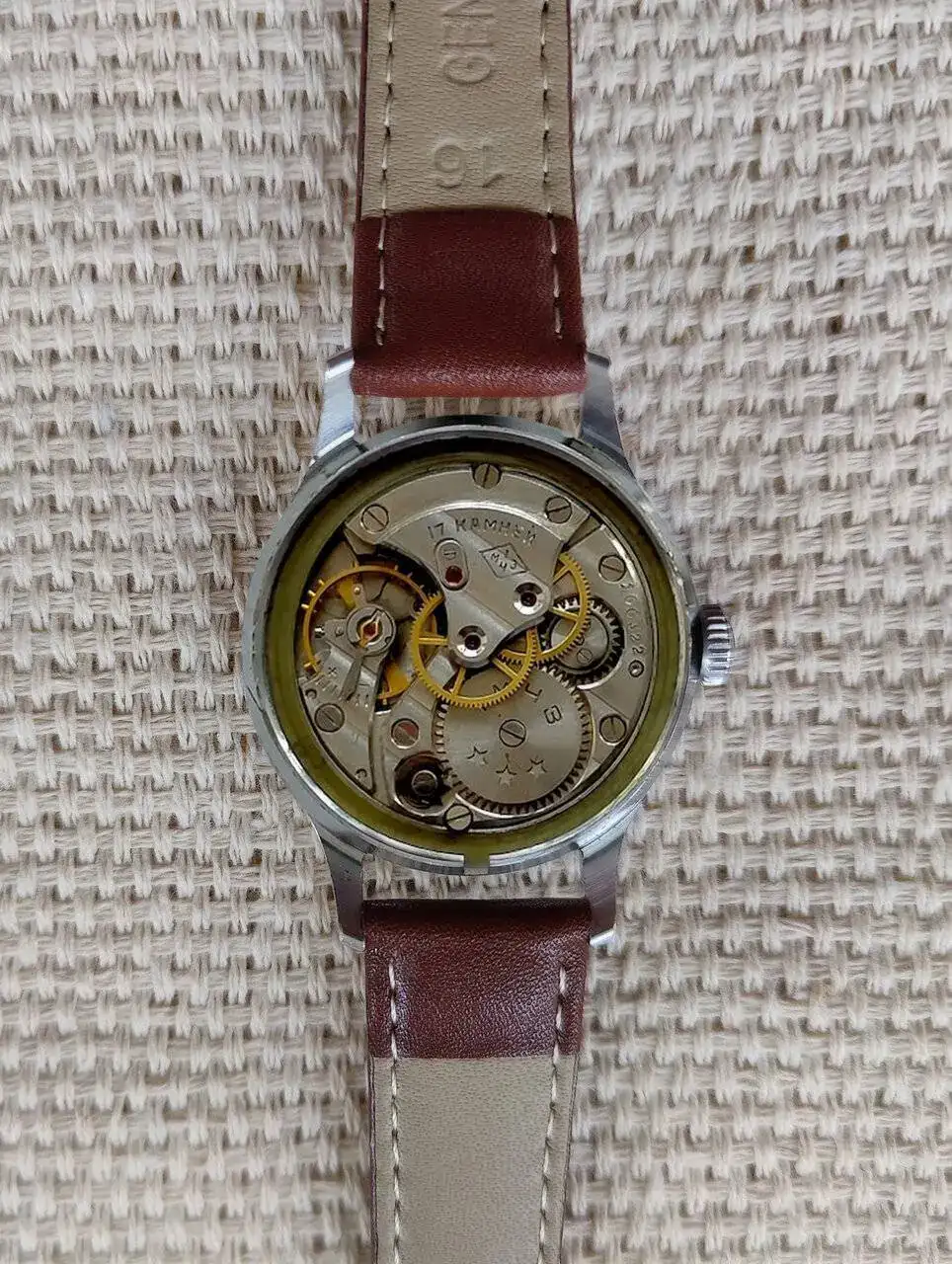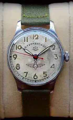 Sturmanskie con calibre 2634 de 17 rubíes. Edición desarrollada para el personal de la Fuerza Aérea Soviética (1954-1960). (Fuente: https://mroatman.wixsite.com/watches-of-the-ussr/sturmanskie?lightbox=dataItem-j5uy5yzv)