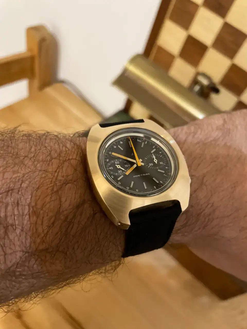 hoy os presento el último reloj que acabo de mecanizar. Os pongo en antecedentes, me regalaron un reloj setentero, un crono con caja de latón mal pavonada, al abrirlo, me encontré con un Valjoux 7733, iba estupendo (a falta de un repuesto que conseguí barato en ebay). Y decidí hacerle una caja de bronce. Buscando ideas por internet, me encontré con un Breitling ref. 508925 que es un crono valjoux 7740 de doble caja, la interior y la exterior de inox. Los que habéis visto algún post mio, sabréis que me gusta mucho mecanizar cajas de relojes para un solo calibre metido en otra caja. Así que me puse a buscar y encontré una caja interior de Breitling para el 7740. Me confié demasiado y al llegar vi que los pulsadores estaban en un angulo más abierto y total… he tenido que tocar por todos lados la interior… resuelto eso, he diseñado una caja setenters de bronce para ese calibre que es como un tanque. Con una correa de cordura del