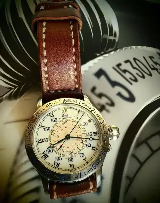 Muchas gracias. Es el Longines Ángulo Horario, conocido como el “Lindbergh”, por el nombre del famoso aviador norteamericano que lo diseñó (su referencia es L2.678.4.11.0). En origen, era un instrumento de ayuda a la navegación. A partir de la altura del sol, haciendo uso del bisel móvil y de la esfera interior, que se acciona con la corona, se calcula la longitud (es decir, la posición respecto al meridiano de Greenwich). Este modelo es una reedición que reproduce el tamaño original, 47,5mm., pero con calibre automático. Aquí tienes dos imágenes de modelos antiguos. Un cordial saludo.