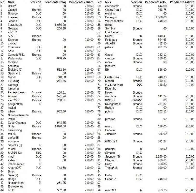 A continuación os adjunto la tabla con los importes pendientes: los que figura un importe es lo que nos consta que tiene pendiente, los que salen a cero ya está todo pagado y los que salen en blanco son foreros que mostraron su interés inicial pero que no han hecho ningún ingreso. En relación al calibre se reparte entre todos los participantes con pagos realiados tal como se explicó.