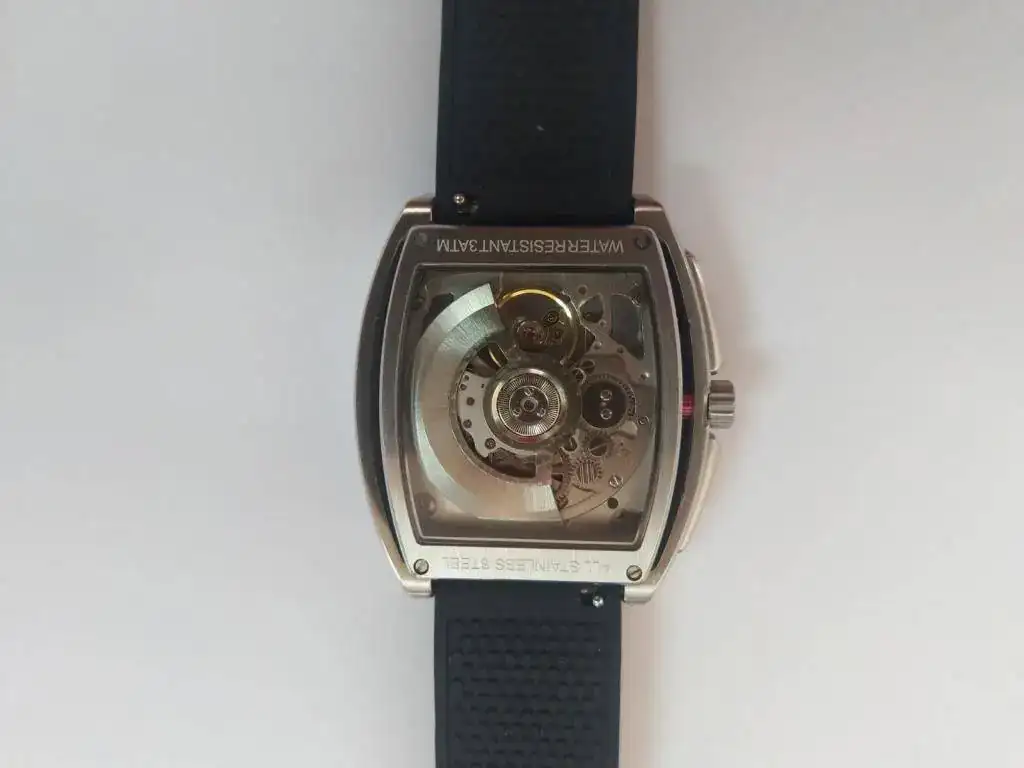 La trasera, también vista, muestra la masa oscilante de un calibre seagull que a pesar de su "chinicidad" es garantía de buen funcionamiento, especialmente si tampoco tiene complicaciones de maquinaria.