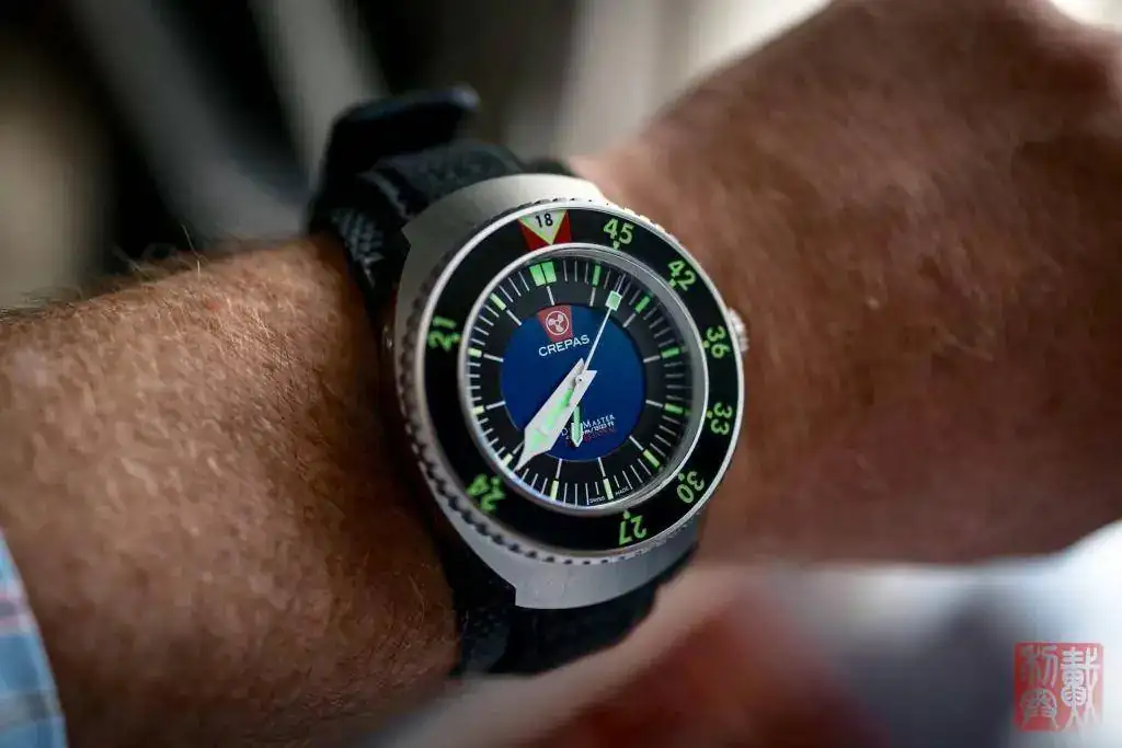 Aquí vemos el funcionamiento del bisel conjuntamente con la minutera, de modo que comprobamos que ya han pasado 19 minutos de los 50 que nuestro buzo va a pasar a 43 metros de profundidad, desarrollando su actividad, probablemente profesional.