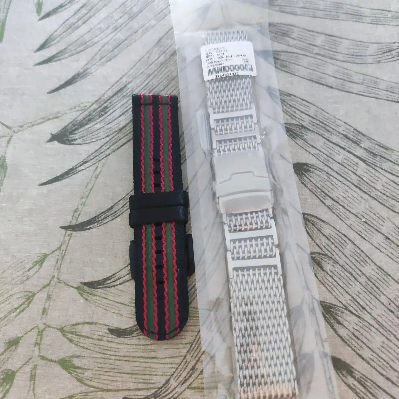 Este reloj se vendía con correa de caucho, como extra se podía pedir una milanesa shark mesh pagando el consecuente cargo,este lleva las dos correas la milanesa nueva sin estrenar habría que cortarla y nunca lo hice.