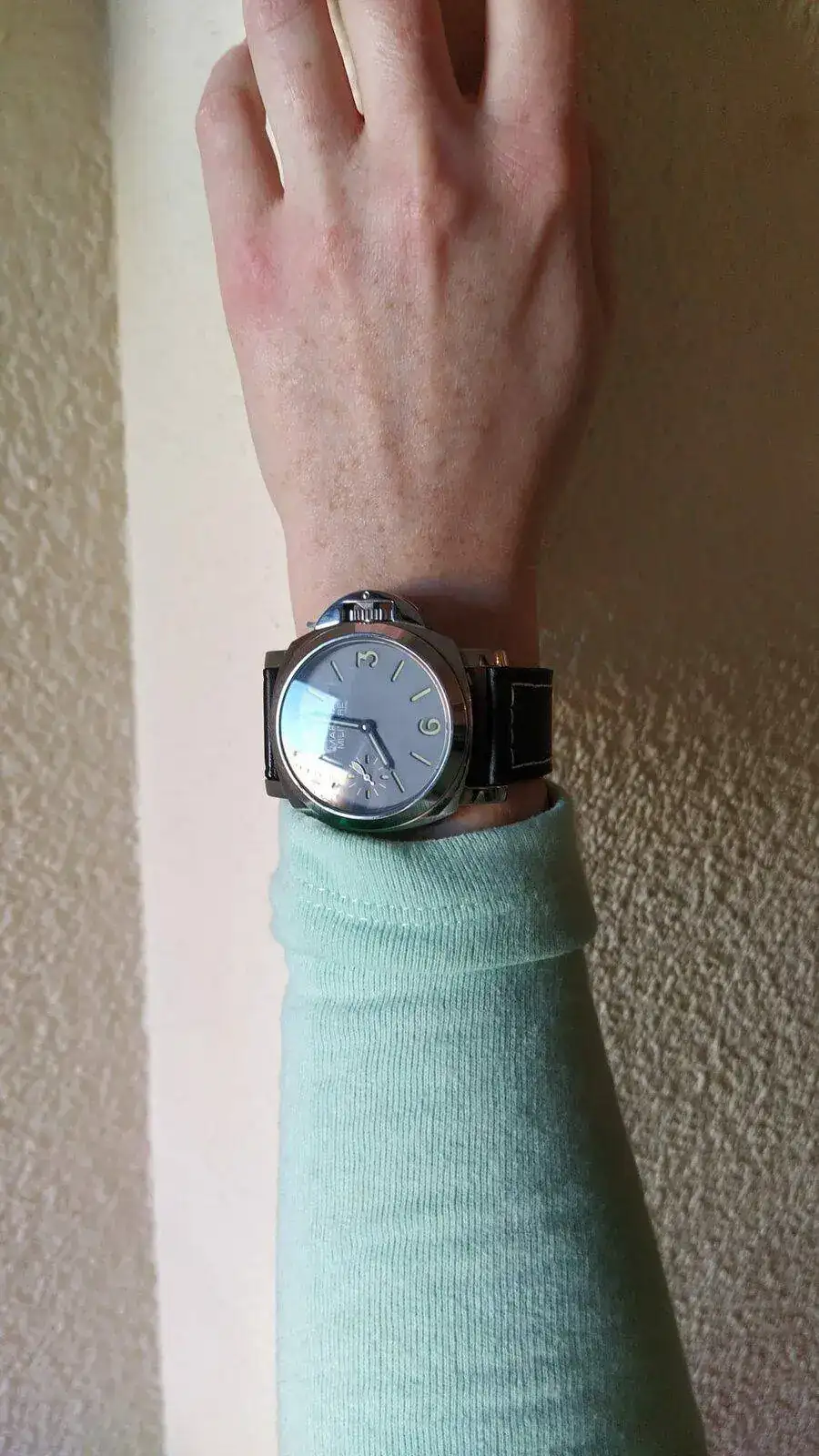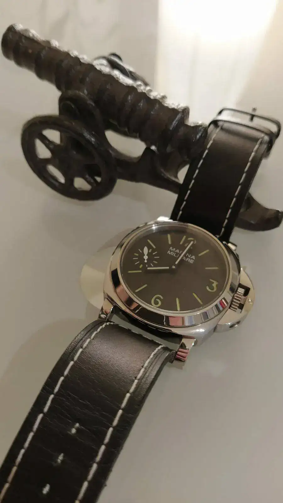 Marina militare, ya sé que este va despertar odio, me entró la fiebre Panerai, no tenía un duro (más o menos como ahora) y a por el chinito este. La verdad que es de los más precisos que tengo. Venía con una correa marrón más dura que la carne de perro, menos mal que por poco pude ponerle la que tiene ahora que es infinitamente mejor. La verdad que ya no me lo pongo mucho y mi chica es la que más se lo pone, me encanta como le queda.