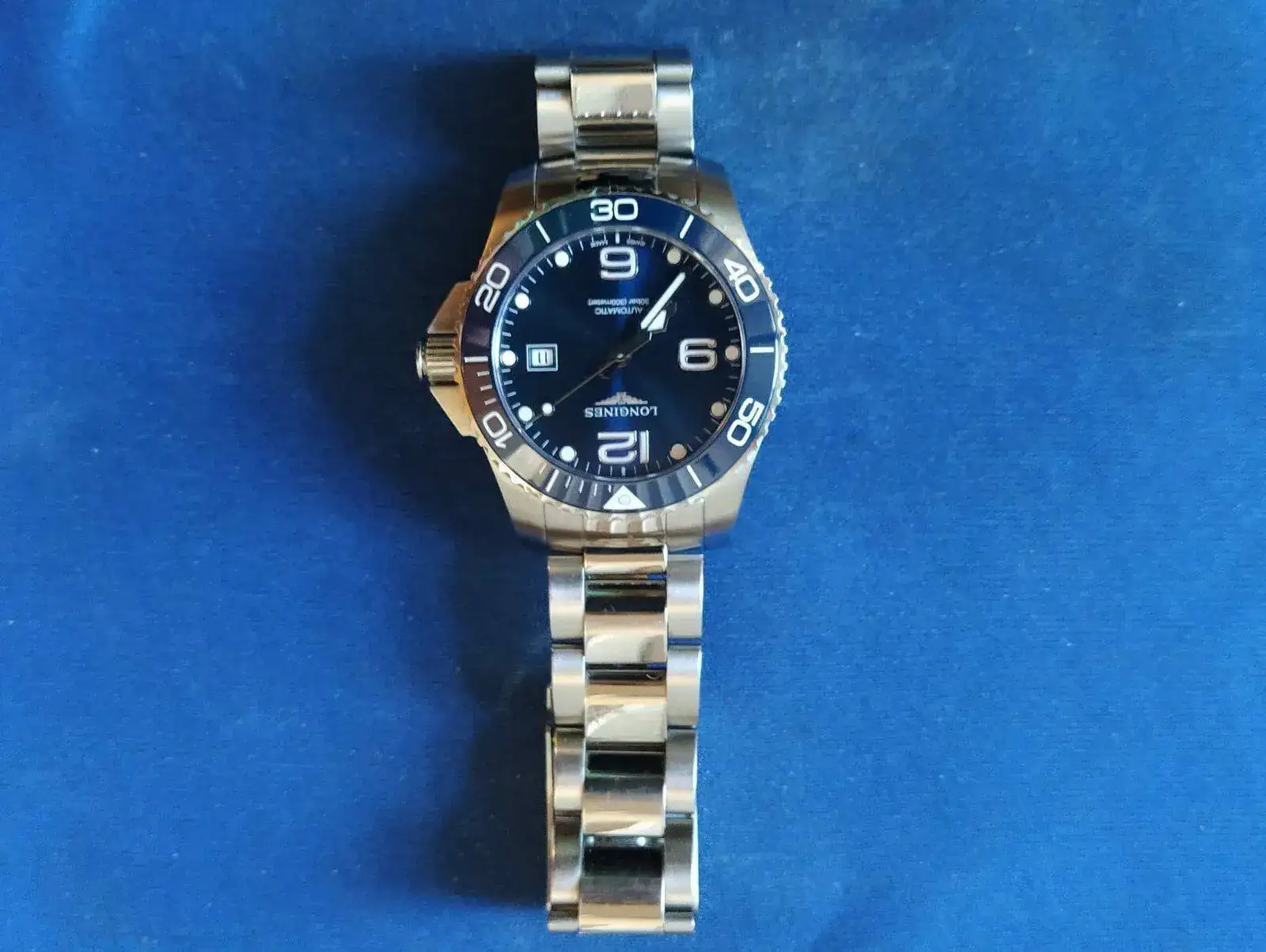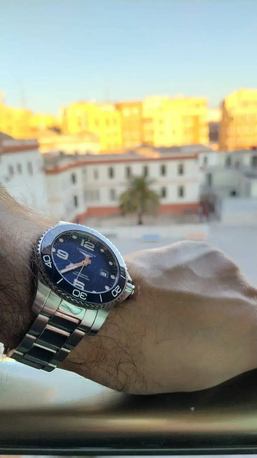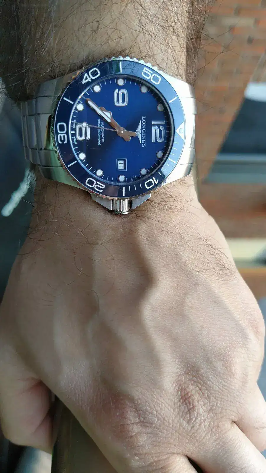 Longines Hydroconquest. Bueno tras una larga racha, 4 años, sin comprar absolutamente nada, me apetecía tener algo nuevo. Todo hay que decir que cuando se presentó en Basel era uno de los grandes detractores, hasta que lo vi en vivo…Amor a primera vista, me hice el duro, me quería resistir hasta que se vino para casa. Que decir que no se sepa ya del modelo, si estas dudando en adquirirlo, pruébalo otra vez y cómpralo no te va fallar. Dentro de lo que son los diver, tiene su estética particular que lo diferencia del resto, vale tendrá índices redondos como quien sabemos, pero también tiene sus números, la maldita manía de dejar el fechador en blanco, un azul precioso, unas agujas originales, unos señores guardacoronas, y lo más importante: que te pega con todo, no desentonas con unos bermudas y un polo en la barbacoa junto a la piscina, en el chiringuito con la cerveza, o con el traje currando.