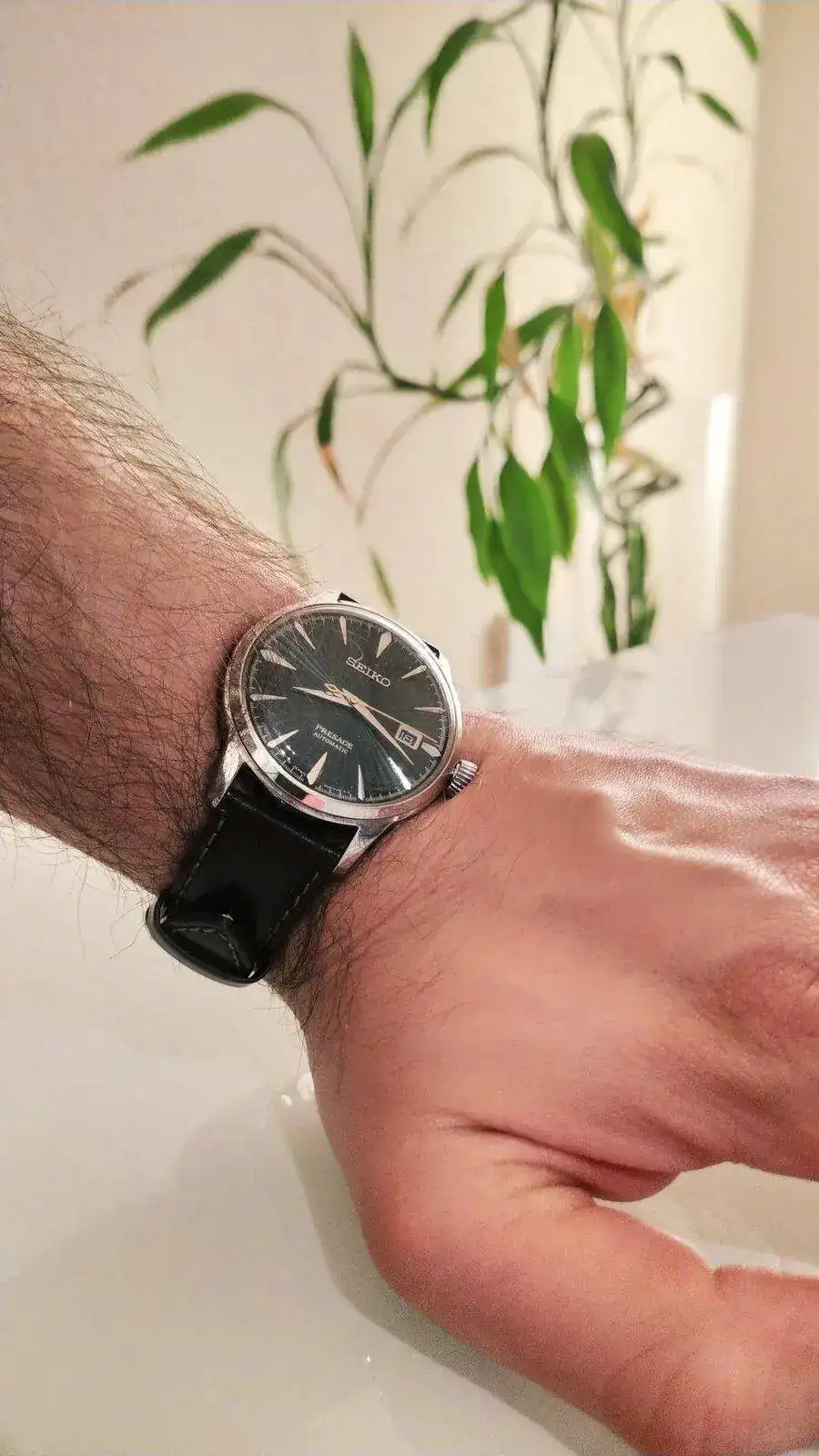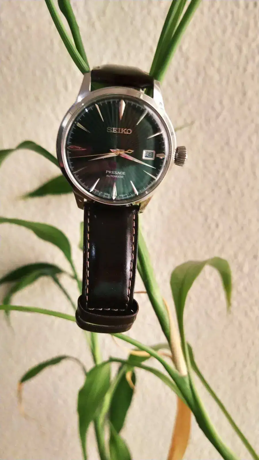 Seiko Presage dial verde Srpd37j1, llevaba dándole la matraca a mí chica diciéndole que “necesitaba” un dial verde en la colección, que estaba de moda y que me quedaría súper bien. Todavía recuerdo como la llevaba de la mano a ver los escaparates y ahí estaba él, yo pensando en ahorrar o esperar si salía alguno en el FCV, y va ella y para mí cumple me lo regala, es una santa con todas las letras. A parte del apego emocional que pueda tener por el reloj, el primer reloj regalado por mí chica y mi primer Seiko, la verdad que el reloj me gusta mucho. Es lo que llamo un formal desenfadado, buena idea para el proyecto del foro![]()