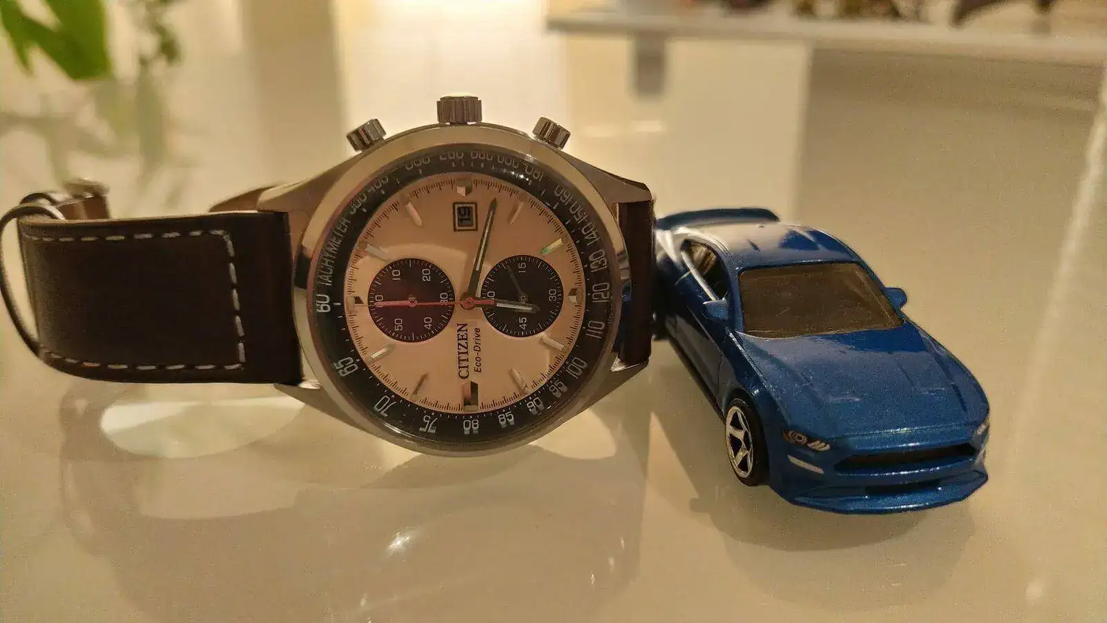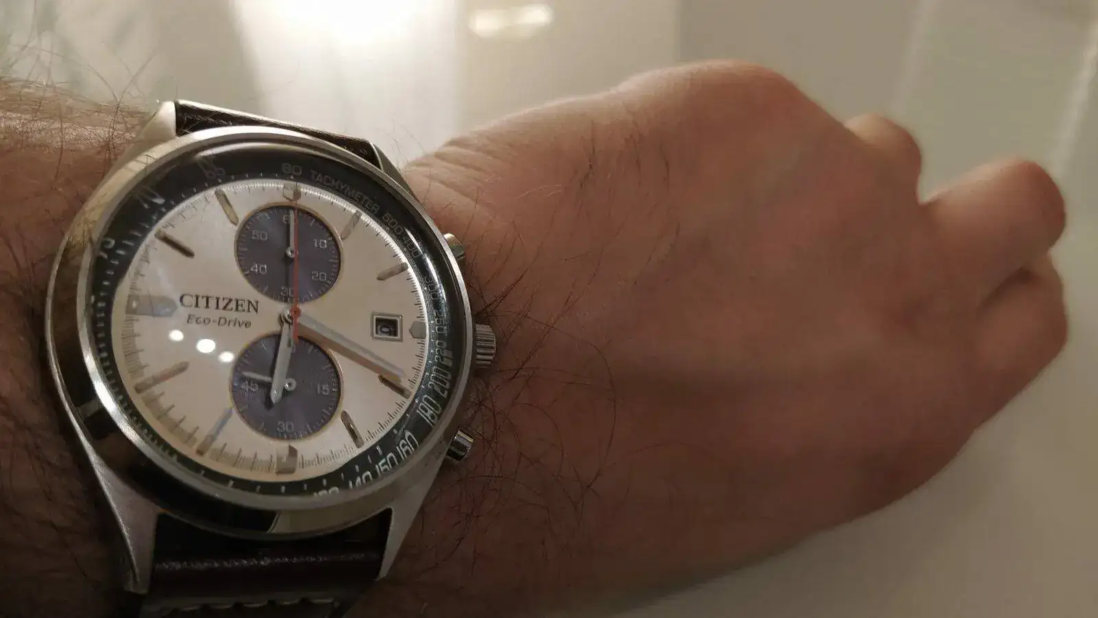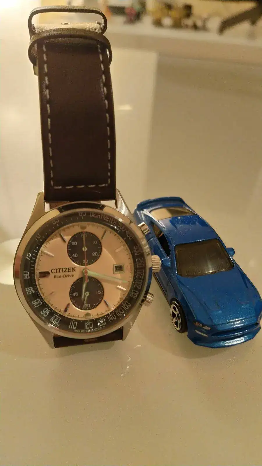 Citizen CA70-2007A El Chandler. Otro regalo de mí chica siempre por mi cumpleaños. La verdad que me quedo sin palabras con ella. Esto de la tecnología Eco-drive es la leche, la prefiero al cuarzo convencional mucho más, no tienes que estar preocupándote de la pila cada 2 años, la aguja del crono se mueve cual automático, se carga con la luz solar, y ojo que necesita una mínima exposición lumínica para cargarse. El estilo me encanta, un toque racing vintage con ese cristal doomed, y esa esfera, imposible de captar perfectamente sus matices, vamos un reloj precioso.