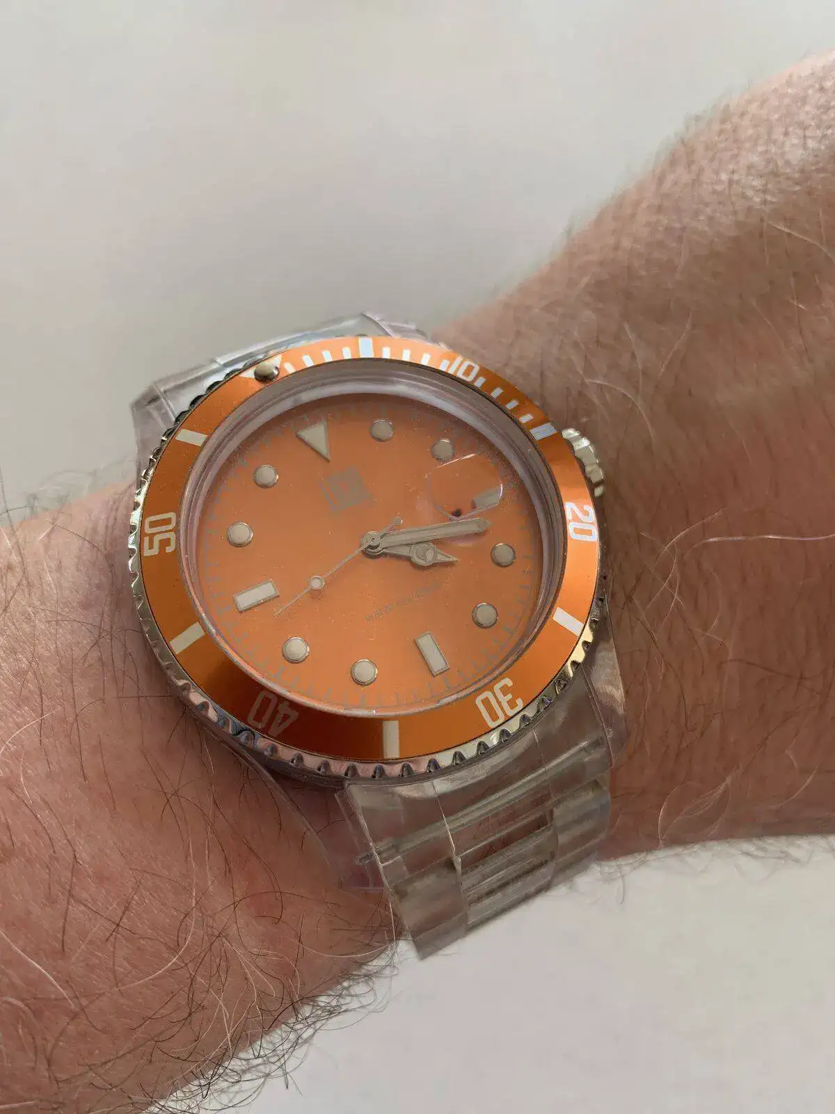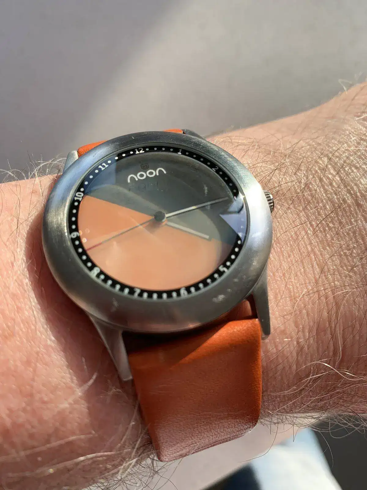 El numero 8 es holandes, marca Noon, tiene la particularidad que son circulos de plastico de color superpuestos y a medida que se mueven los minutos y las horas cambia el color del dial entre el naranja y el gris. En la foto a las 4;15 y las 8;15 para ver la diferencia de colores del dial