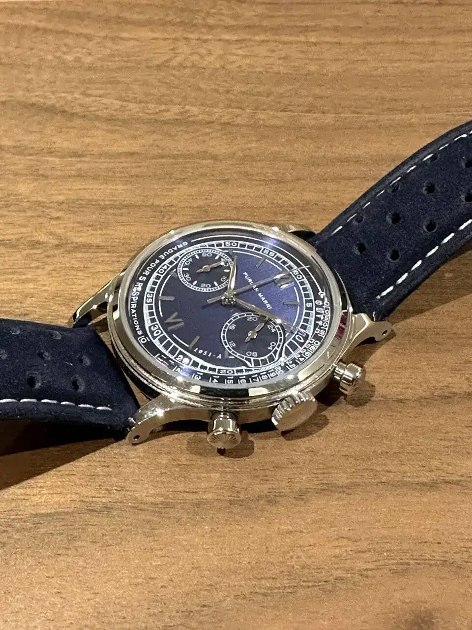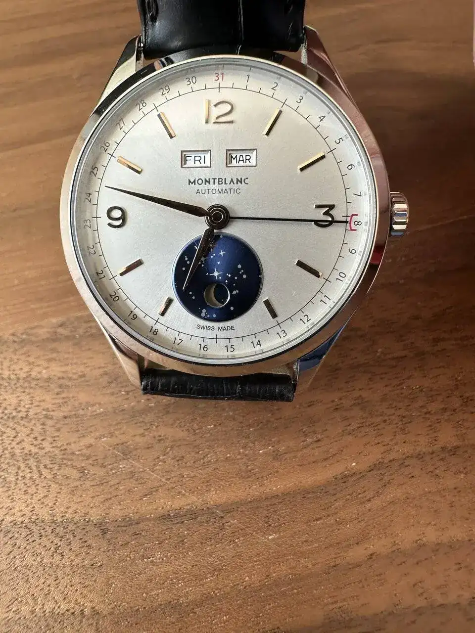 Una pasada de reloj, de largo el que más complicaciones tiene de mi colección y el BBB de los que tengo, me encanta su fase lunar, la imagen del cielo nocturno del hemisferio sur en su subesfera, lo compré en una joyería que se jubilaban a un descuento increíble y es de los relojes que creo que tiene una relación calidad-precio más acertada. Lo que menos me gusta del reloj es que sea Montblanc, ya que al ser marca de plumas entre los aficionados no recibe el cariño que merece, sobretodo porque compraron la antigua Minerva y sus técnicos con su "savoir faire" siguen alli.