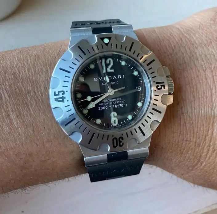 Un reloj que siempre me gustó y que conseguí comprar hace dos años a través de un comerciante de relojes de mi provincia. Y con la suerte de estar en excelente estado sin tener que pagar los cerca de 6K que costaba cuando salió el modelo por el 2.000, siendo uno de los relojes en metal no precioso del catálogo BVLGARI más caros. No era de extrañar porque entonces los relojes de lujo no se hacían con capacidades tan extremas para uso profesional.