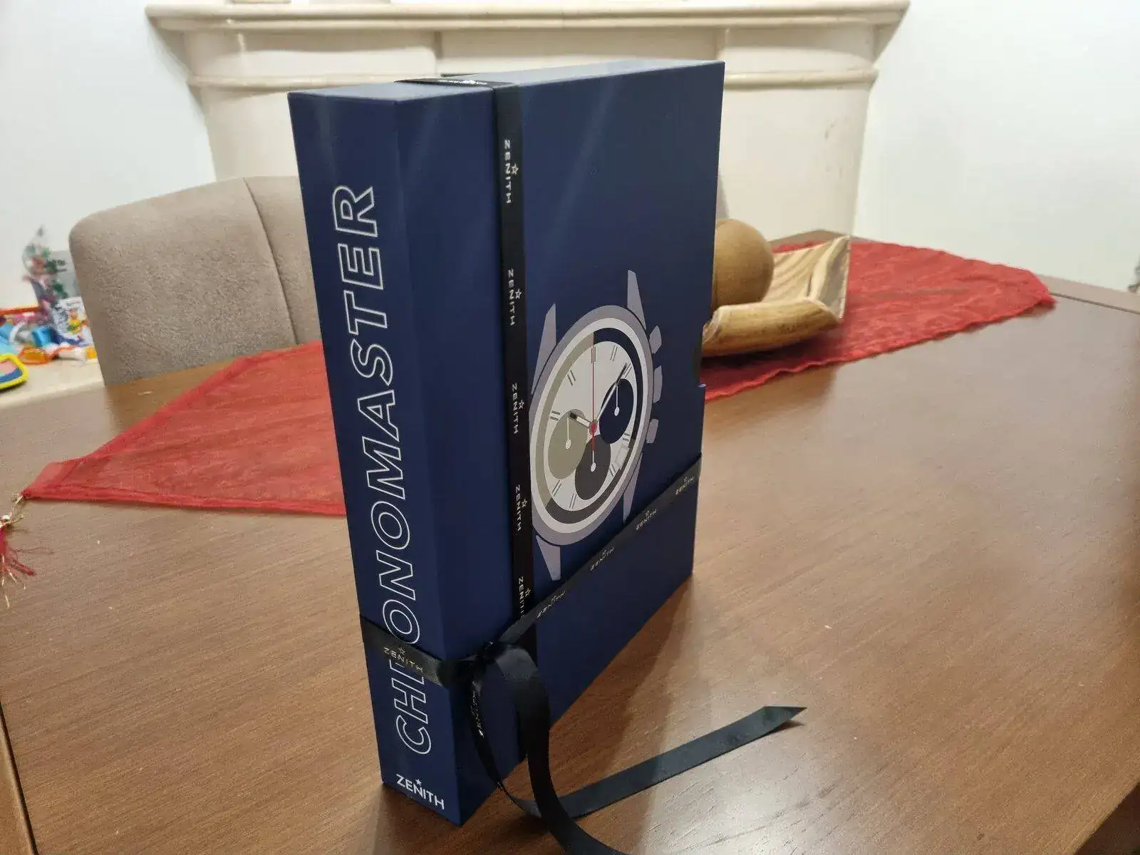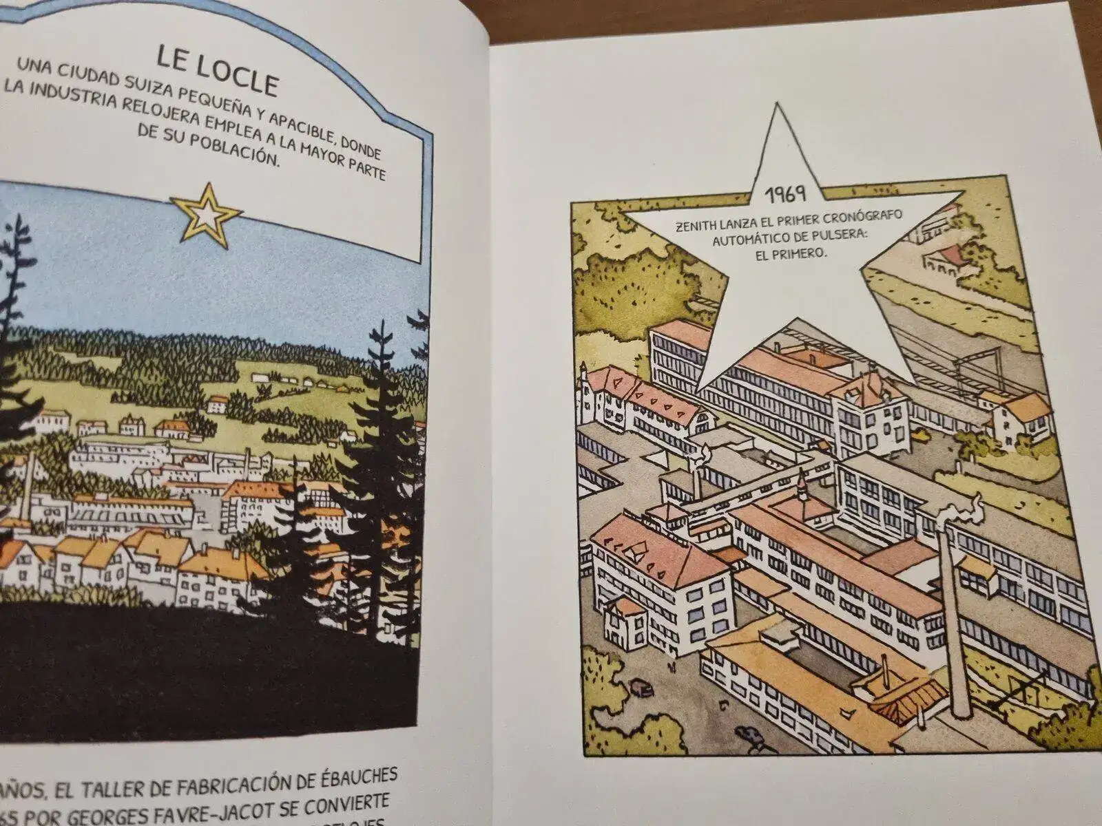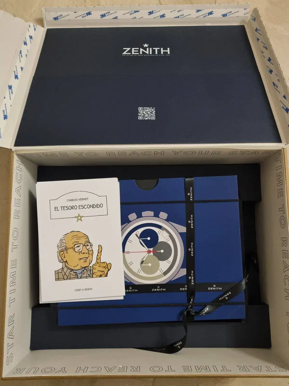 Venía muy completo de dotación, con una caja tipo libro muy curiosa y diferentes folletos, entre ellos un cómic de un conocido autor suizo llamado Cosey, en el que relata la historia del crono Zenith y de Charles Vermont.
