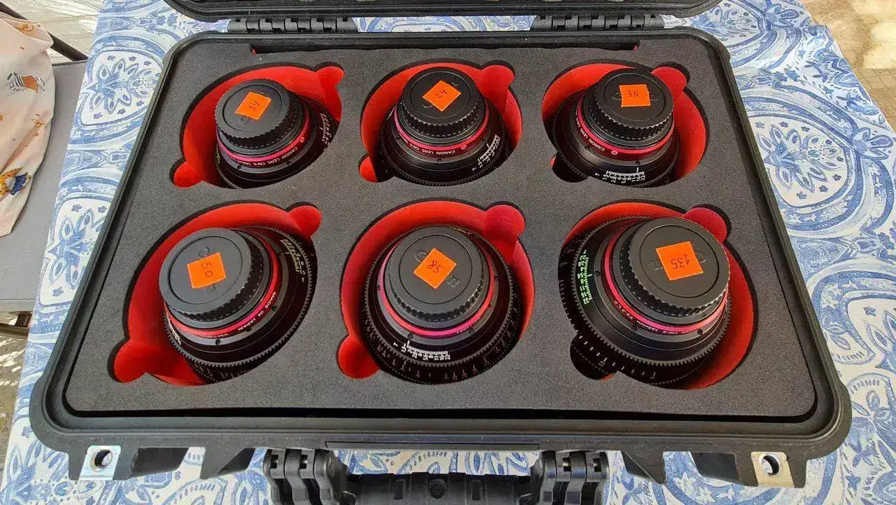 - Maletín con 5 con 6 objetivos Canon Cine: 6 Ópticas Canon Cinema con montura EF, 4K compatibles con sensores Full Frame, APS-H y APS-C. Perfectas para grabaciones 4K y para cámaras Super 35mm. Se adaptan a cualquier montura de cámara con adaptadores. Producto profesional que se ha usado 2 veces y no se diferencia de nuevo. Viene con maleta.