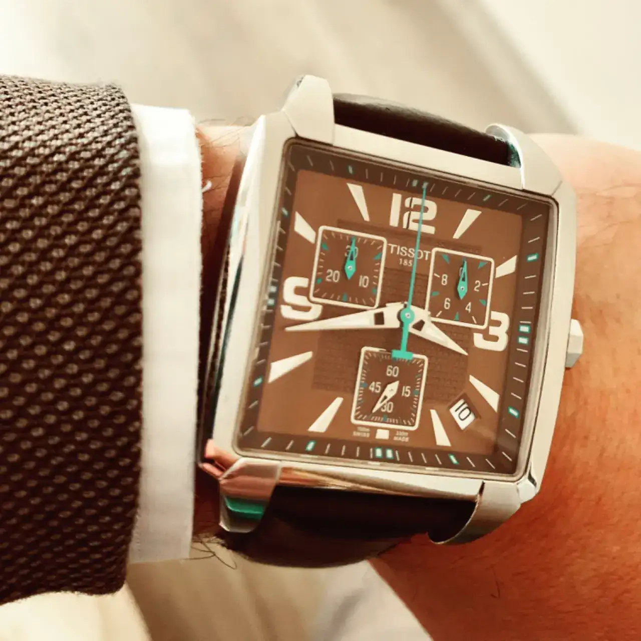 Al año siguiente, paseando por la calle vi un reloj en mi joyería de confianza que me enamoró, y era este Tissot Quadratto color chocolate (hay que decir que mi reloj deseado desde niño era un Monaco…). Y lo pillé sin dudarlo.