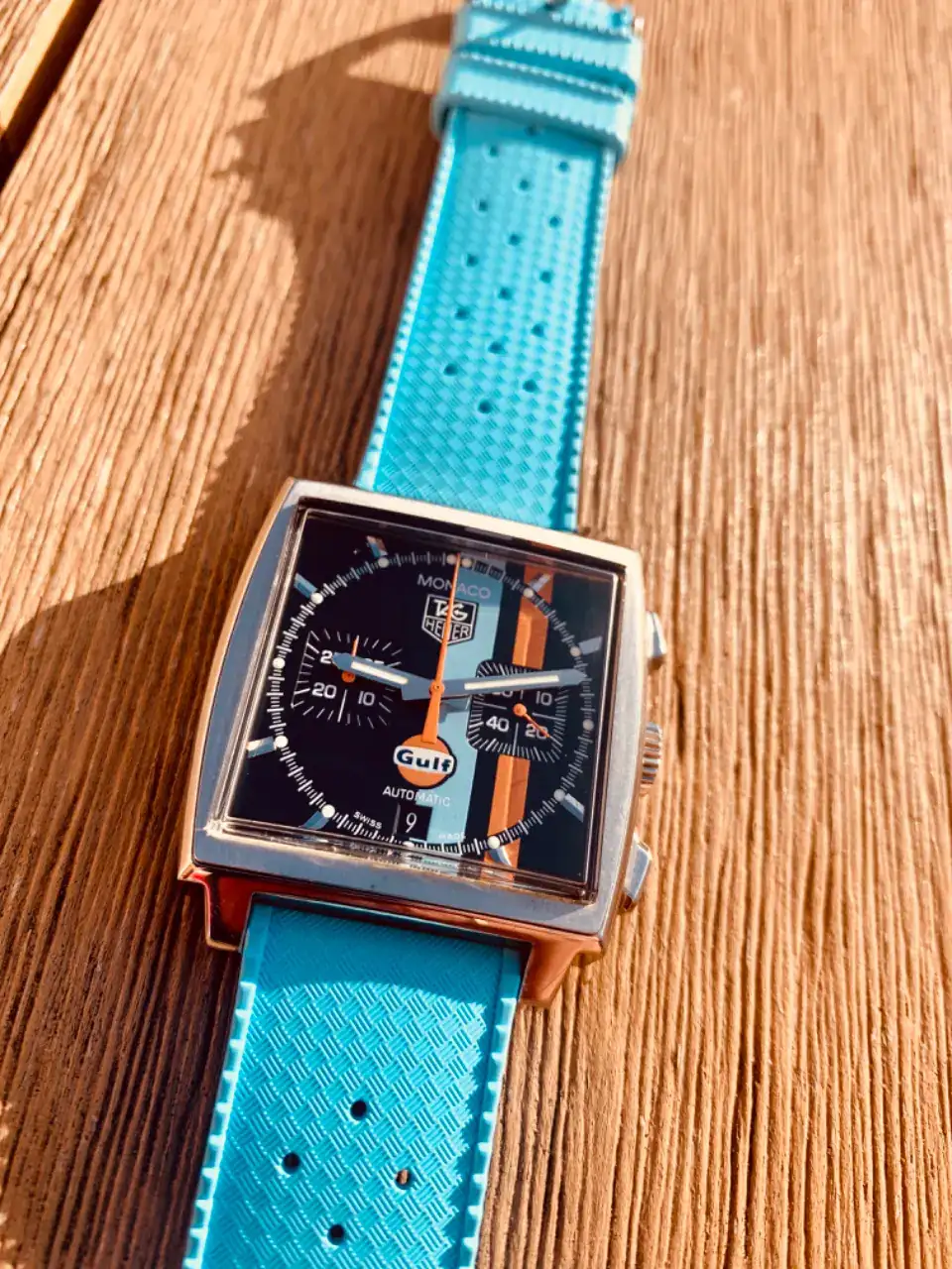 En 2008, por fin pude cumplir mi sueño relojeril hasta la fecha, hacerme con un Tag Heuer Monaco. Por aquellas fechas sacaron una edición “limitada” de 4000 piezas edición Gulf, que me gustó bastante y me hice con ella. Reconozco que tiempo después dudaba si había acertado con esa versión y varias veces pensé en venderlo y hacerme con otro Monaco más “convencional” pero por suerte no lo hice, y aprendí a disfrutarlo como se merece y como hago cada vez que lo uso. Además, el juego que me da con las correas es brutal. En ese momento, creí haber alcanzado la cima relojera, era lo que siempre había querido. Dejo varias fotos de este, es que me vuelve loco 🤪