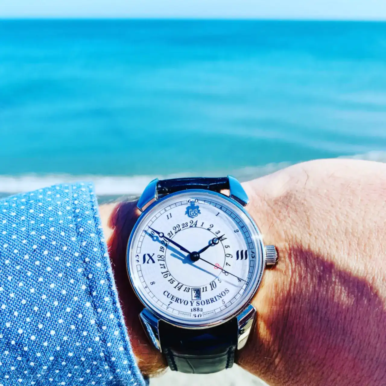 2019 fue en gran año en todos los sentidos. Mi novia y yo nos casábamos en Septiembre y estuve casi 1 año buscando el reloj perfecto para mi boda. Iba a ser un autoregalo, asi que busqué, miré y probé todo lo que pude. Omega (ese Deville aún me hace ojitos cuando lo veo), Zenith (Elite Chronograph Classic, qué delicia de reloj), Montblanc, Baume & Mercier… y, cómo no, Cuervo y Sobrinos, una marca poco o nada vista que me atraía desde que la conocí. Así que me hice con mi CyS Historiador GMT, y me acompañó el día de mi boda (junto con otros 2 relojes, los de mis abuelos… aunque esa historia para otro día jeje).