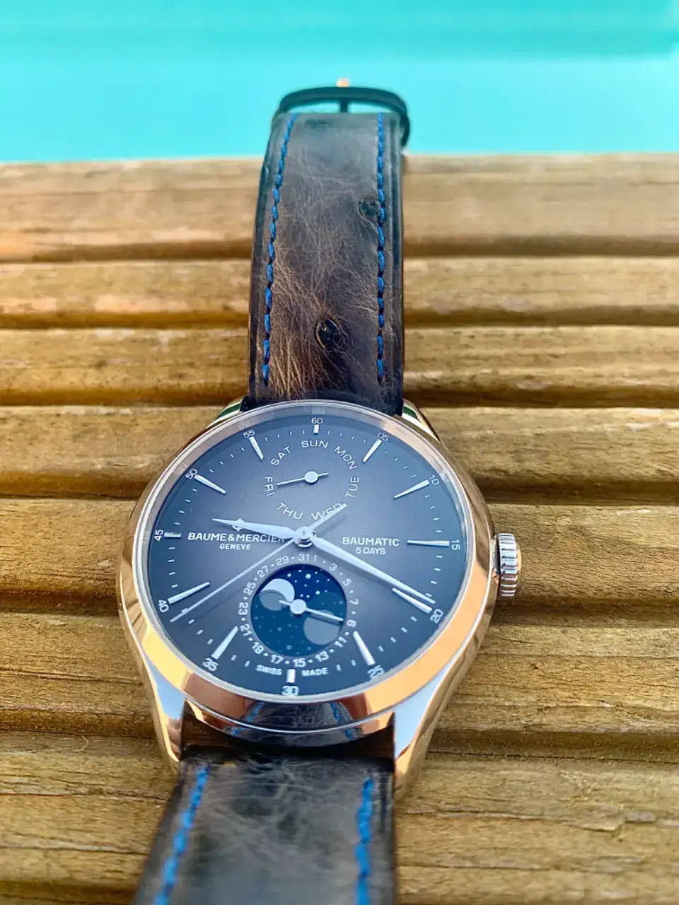 2 años después de mi niña, volvíamos a ser padres (esta vez un niño) así que ya tenia nueva excusa 😂 y decidí añadir a mi caja una complicación que siempre me había gustado, las fases lunares. Y me hice con mi querido Baume & Mercier Clifton manufactura con calendario completo y fases lunares. Una esfera gris degradado que me fascina. También le cambié su cuero original azul por una correa de Atelier Ferrer en piel de avestruz gris y costuras azules. Una delicia EMHO.