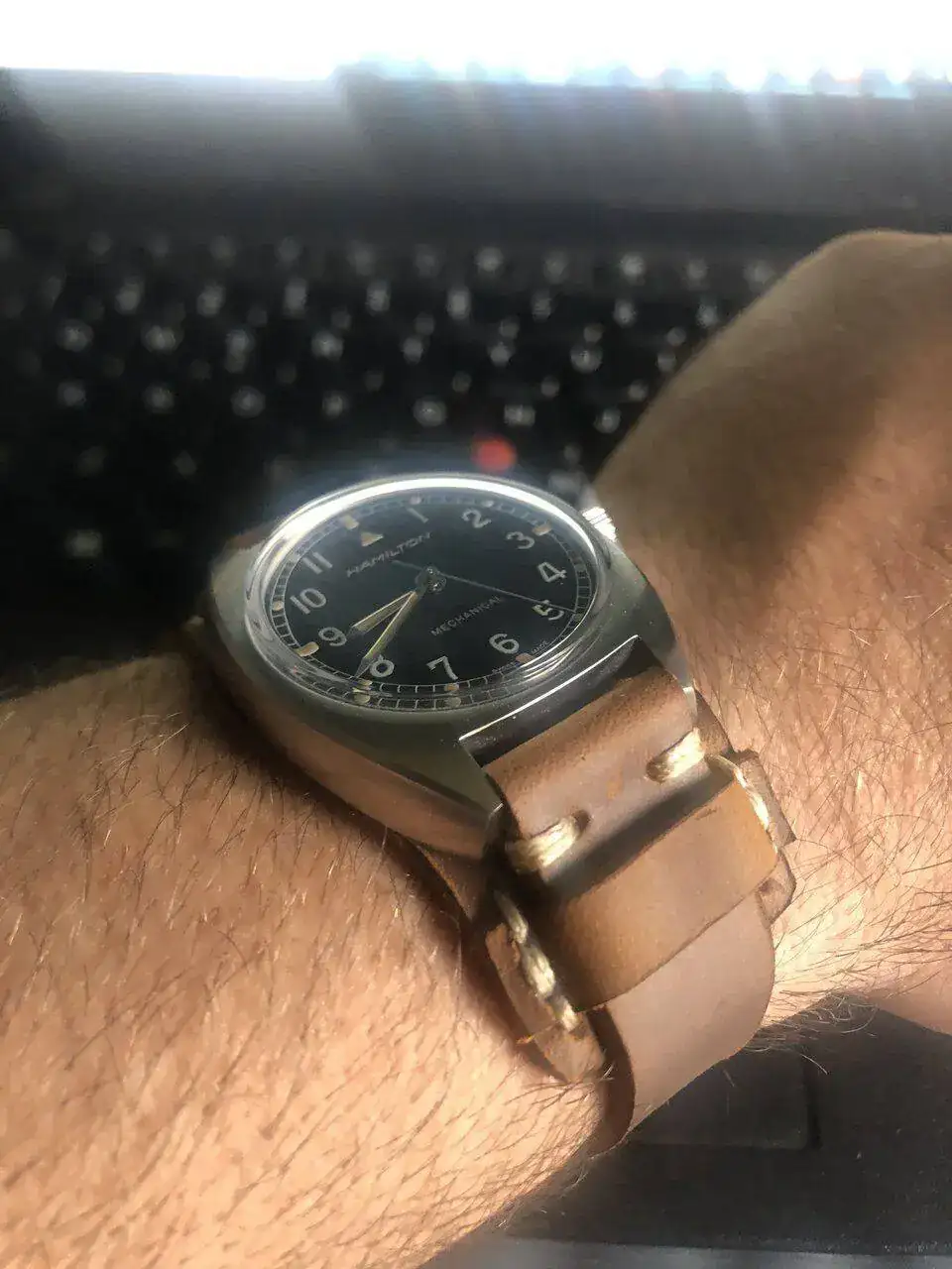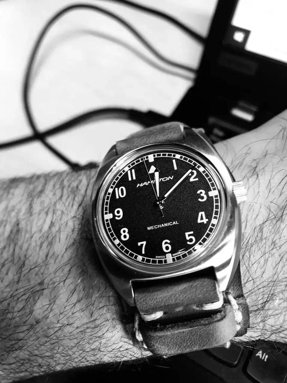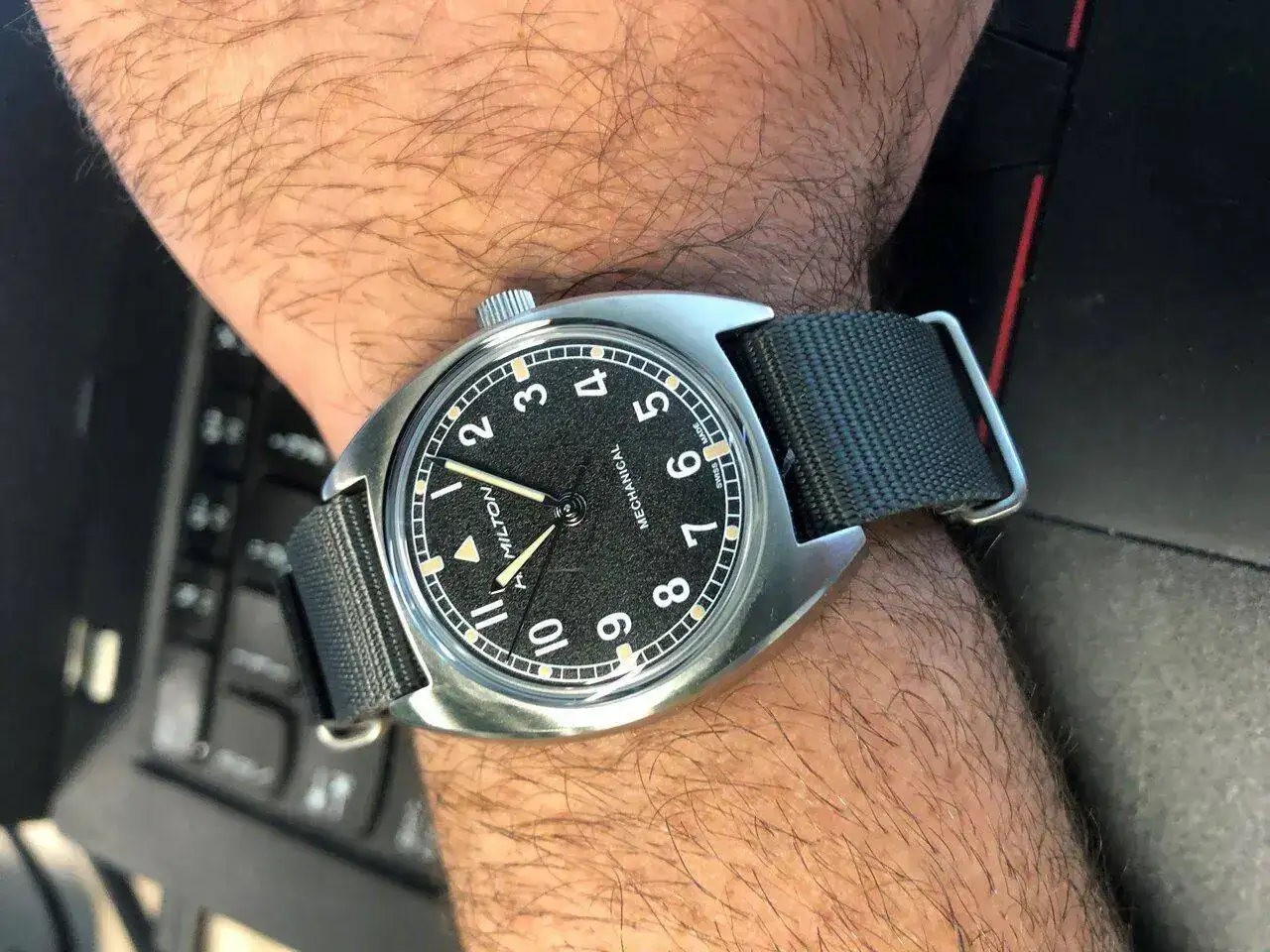 Y el último en llegar, un Hamilton Khaki Aviation Pioneer de 36x33mm, que desde siempre me encantaba. Lo recibí hace unos 10 días y me está encantado. El encanto de darle cuerda manual, su dial con algo de textura, su cristal abombado con distorsiones. De momento estoy en la fase de enamoramiento y lo estoy llevando con una Bund que me hizo el compi @Zero que creo que le sienta de miedo.