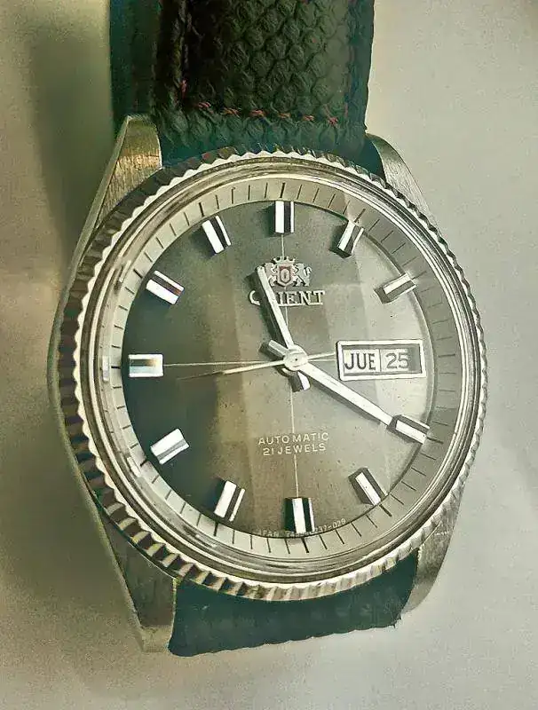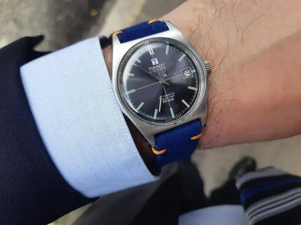 Hoy con mi último vintage, un Seiko 7016-7000 azulito. Lo compré un poco machacado y en los últimos días le he dado un repaso estético. Pintado y relumeado de agujas, también le he limpiado un poco la esfera. He lijado, cepillado y pulido caja y bisel para recuperar esquinas. El cristal lo pulí con lijas hasta de grano 5000 y luego estrené el polvo de pulido.