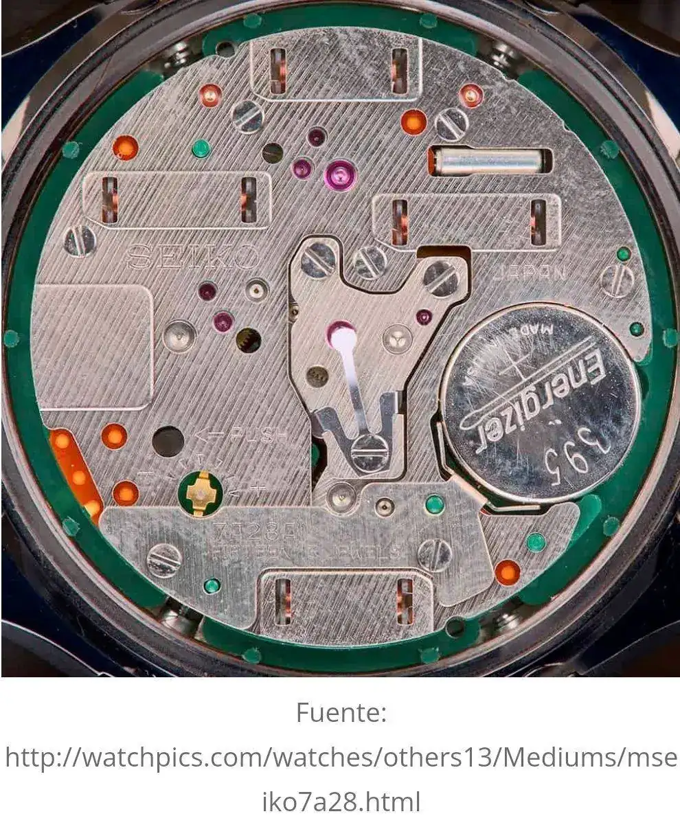 Creo que lleva el movimiento 7A38, igual que el 7A28 pero con ventana de fecha y de día. Tengo entendido que es un cronógrafo de cuarzo tiene cierta similitud a uno mecánico y se puede desmontar y reparar. Que me corrijan si no es así. Un saludo.