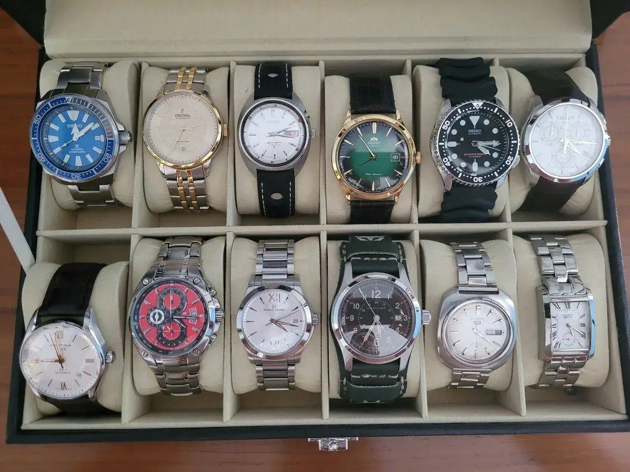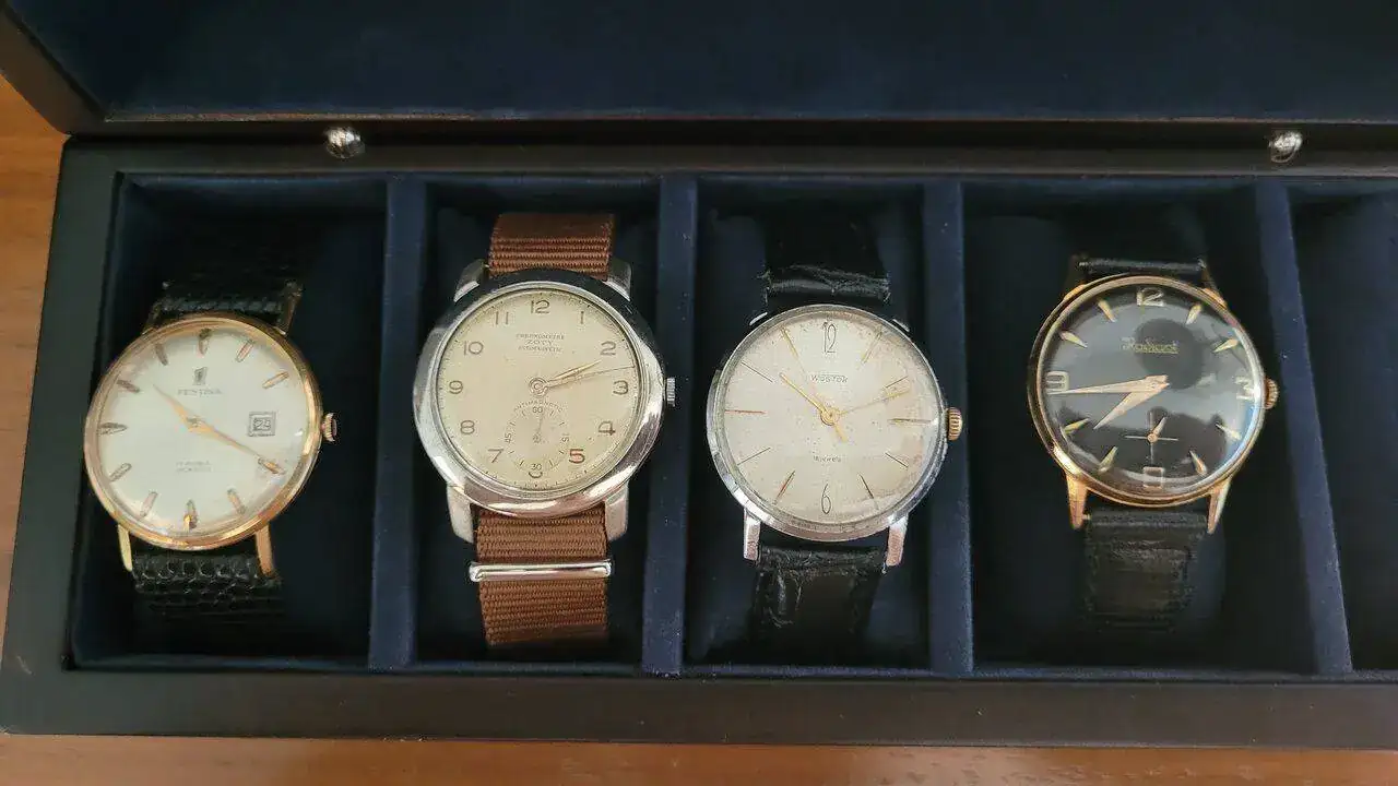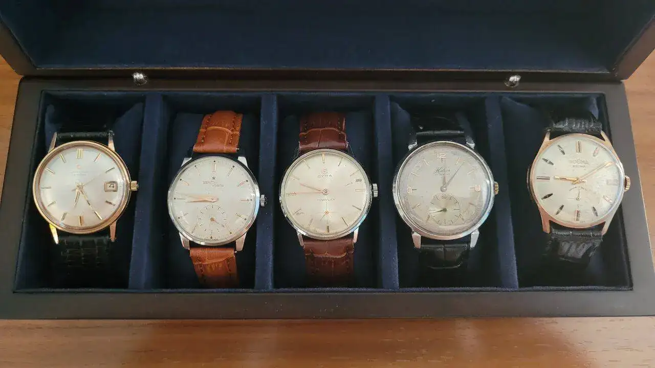 Y para el final los abueletes. Mis vintage, todos en buen estado y funcionando con buena marcha. Limpiados y aceitados por mí (a falta de las últimas incorporaciones) :entre ellos hay Certina, Dogma, Zenith, Radiant (la esfera estaba en muy mal estado y ha sido restaurada por el maestro y compañero del foro @VICENTE RAMIREZ. Festina, Halcón, Vostock, Cyma.. El Zoty lleva un movimiento Nivada.