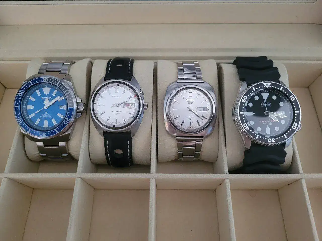 Tenemos un cuarteto de Seikos automáticos: un Samurai de 2021 un Bellmatic del 72, un Seiko 5 del 74 y el famoso 007 comprado en 2019.