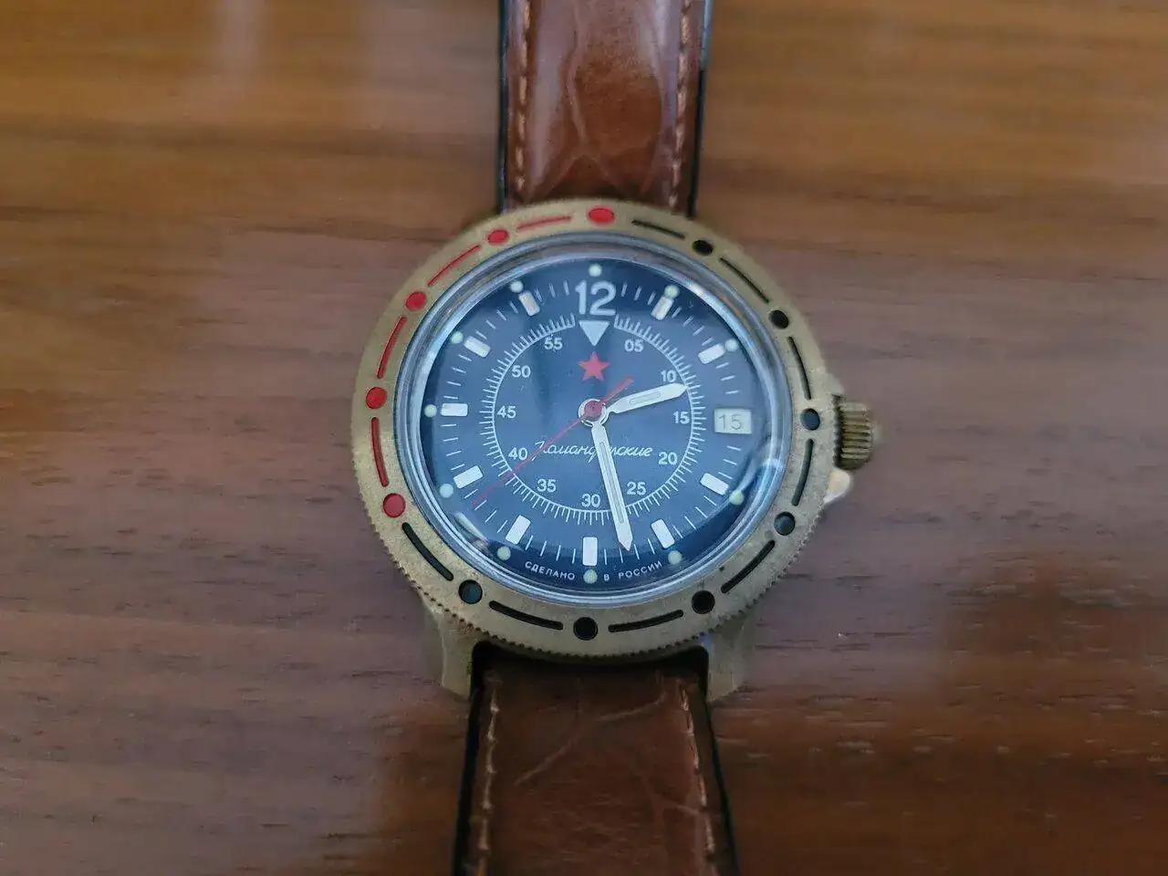 Un bronce o brassss. A saber la aleación del material base de este Vostock al que le quité el cromado :