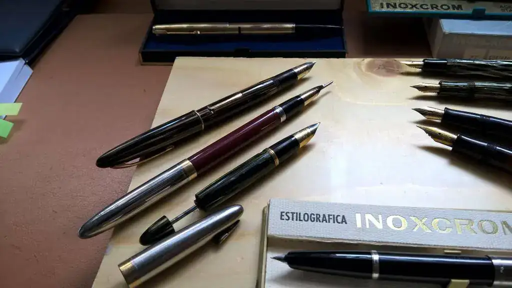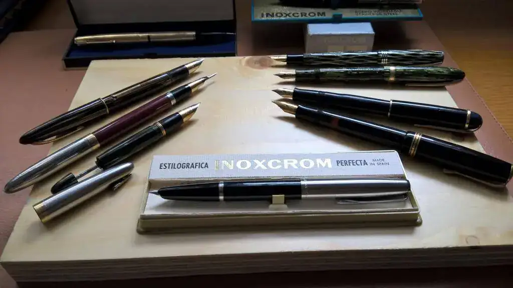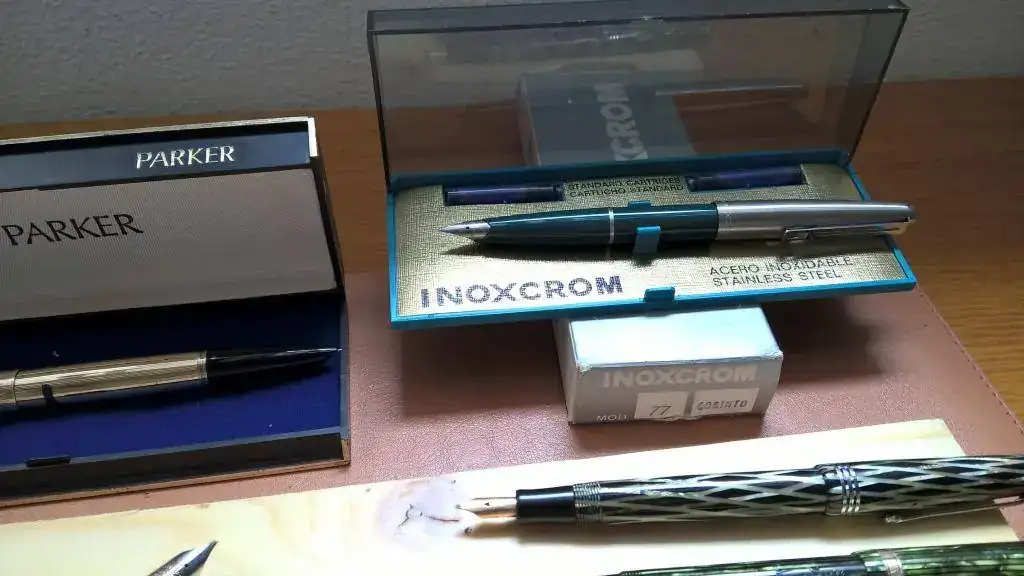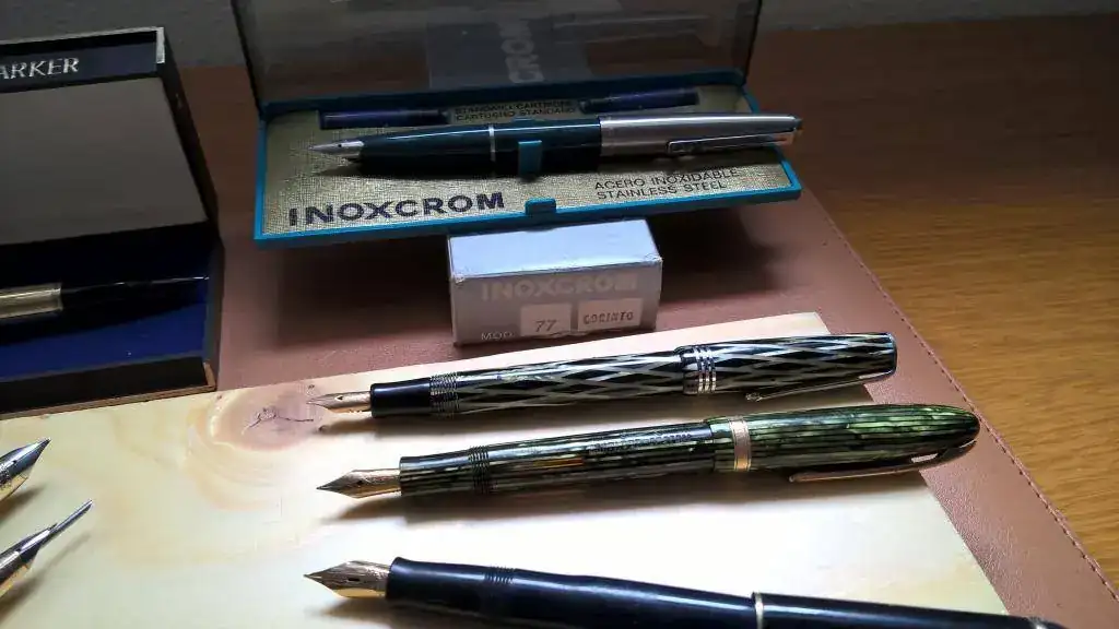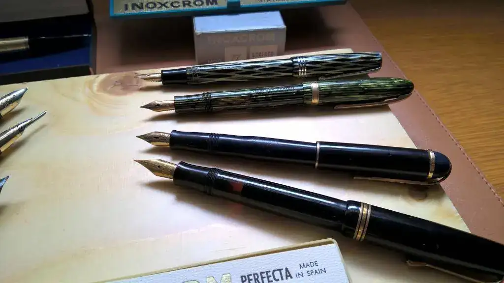Las últimas…una Osmia Faber Castell mini y otra mini de rombos negra y verde sin nombre, pero con plumín de oro y flex.