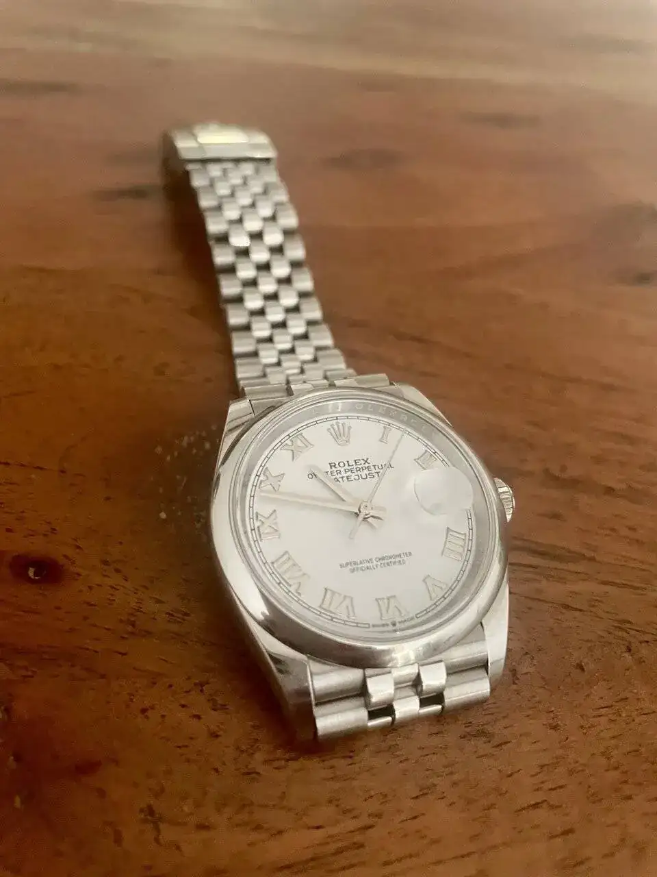 Y por último, el Datejust, que fué mi autoregalo de bodas, y nunca saldrá. Además de ser mi primera corona le tengo un cariño especial porque era el reloj que llevaba mi abuelo y siempre me ha chiflado. Tan solo espero a que en su primera revisión me lo “desromanicen” y hacerle el cambio de esfera a la silver (era mi prioridad cuando lo pedí, pero llego este en blanca y romanos y me lo cogí del tirón, no pude aguantarme, y la verdad que me resulta muy muy muy elegante y lo uso muchisimo, pero el silver es mi debilidad). Al desromanizarlo, seguramente quede menos de vestir y más de diario, cosa qhe me importa poco, y ademas sigo quedandome con uno en romanos que sería el Tank. De hecho, la esfera silver ya la tengo a buen recaudo en mi DO (la tiene guardada a mi nombre) y en un par de años espero hacerle el cambio.