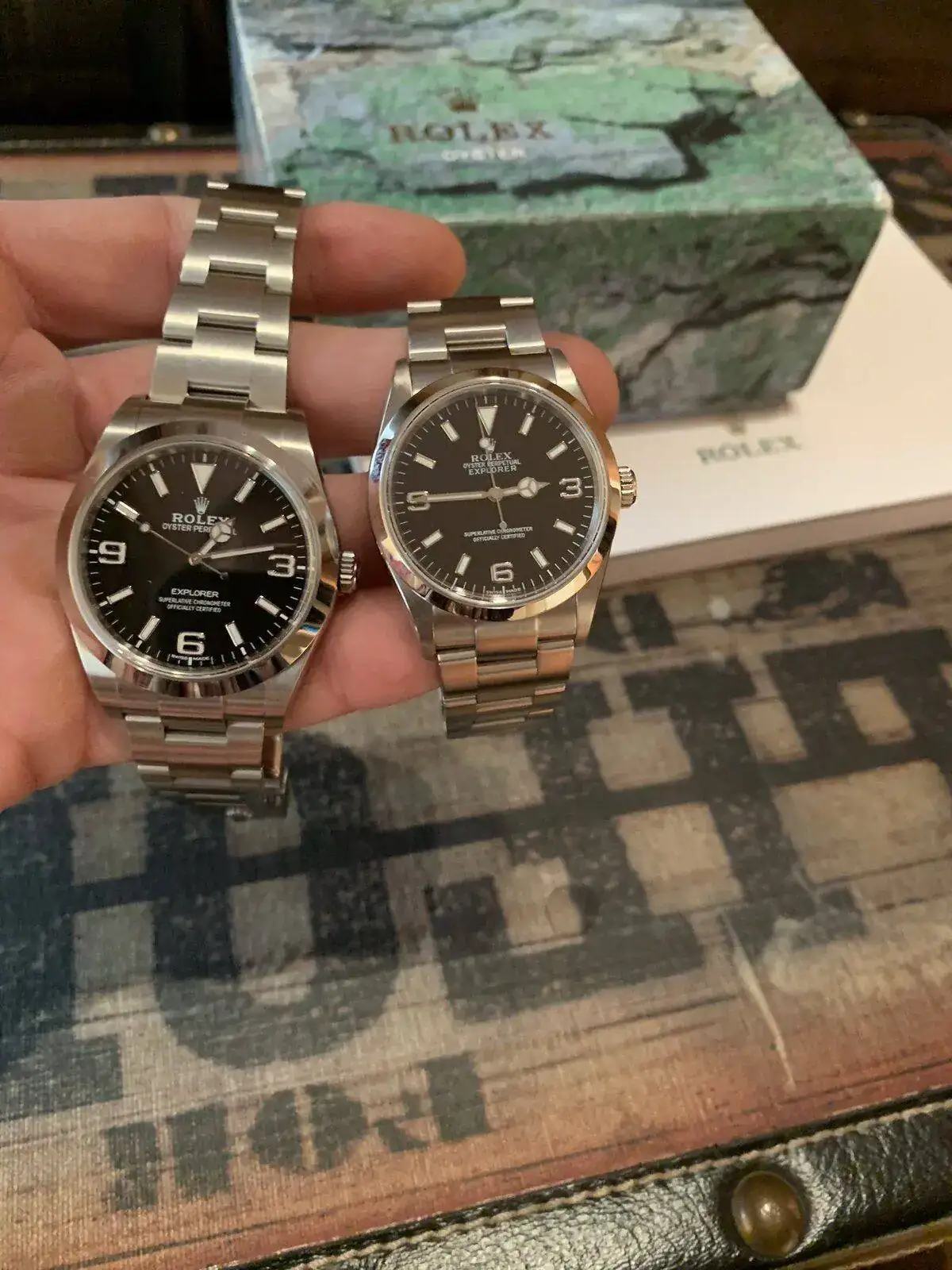 Tuve los dos, y a día de hoy, volveré ( aun esta por ver ) al 36 con ojos cerrados. El explorer en 36 guarda una simetría que no tiene el 39! Diferente son los gustos, ahí cada uno, lo que le guste, pero en Harmonía ya en proporciones, el 36 gana por goleada.. y he tenido los dos, y los he usado los dos con ganas..Opino igual. A punto estuve del 36 por el simple hecho de que el 39 estaba descatalogado. Mi futura mujer me regaló por sorpresa un 39 y no puedo estar mas contento, ambos me quedan bien en be mis 16cm y poco de muñeca, pero para reloj único me tira mas el 39, si tuviera tambien un sub o algo de 40-41 y compacto quizas hubiera ido al 36. Por cierto, se habla mucho de desproporcionado y tal, pero yo no aprecio nada de eso, es mas, creo que han dejado las fuentes del 39 en el 36 (o si no, creo que la han dejado mas grande que en el 114270) eso hace la esfera de este ultimo me parezca mas apelotonada y no tan fina como quedaba en el 114270, ademas de verla mas vacía en la parte inferior, todo esto emho.