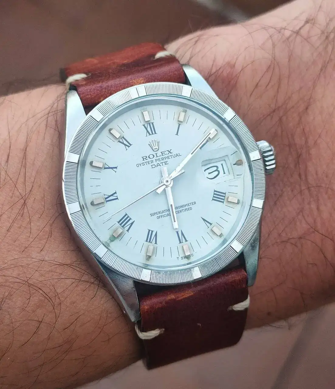 Datejust del 72, calibre 1570, sin pase de fecha, ni siquiera semirápido, pero sí parada de segundero. El armis es de los de chapa antiguos, no de tornillo, pero le he calzado una de cuero.Tan bonito como un "Big Crown". Por éso me gusta tanto.