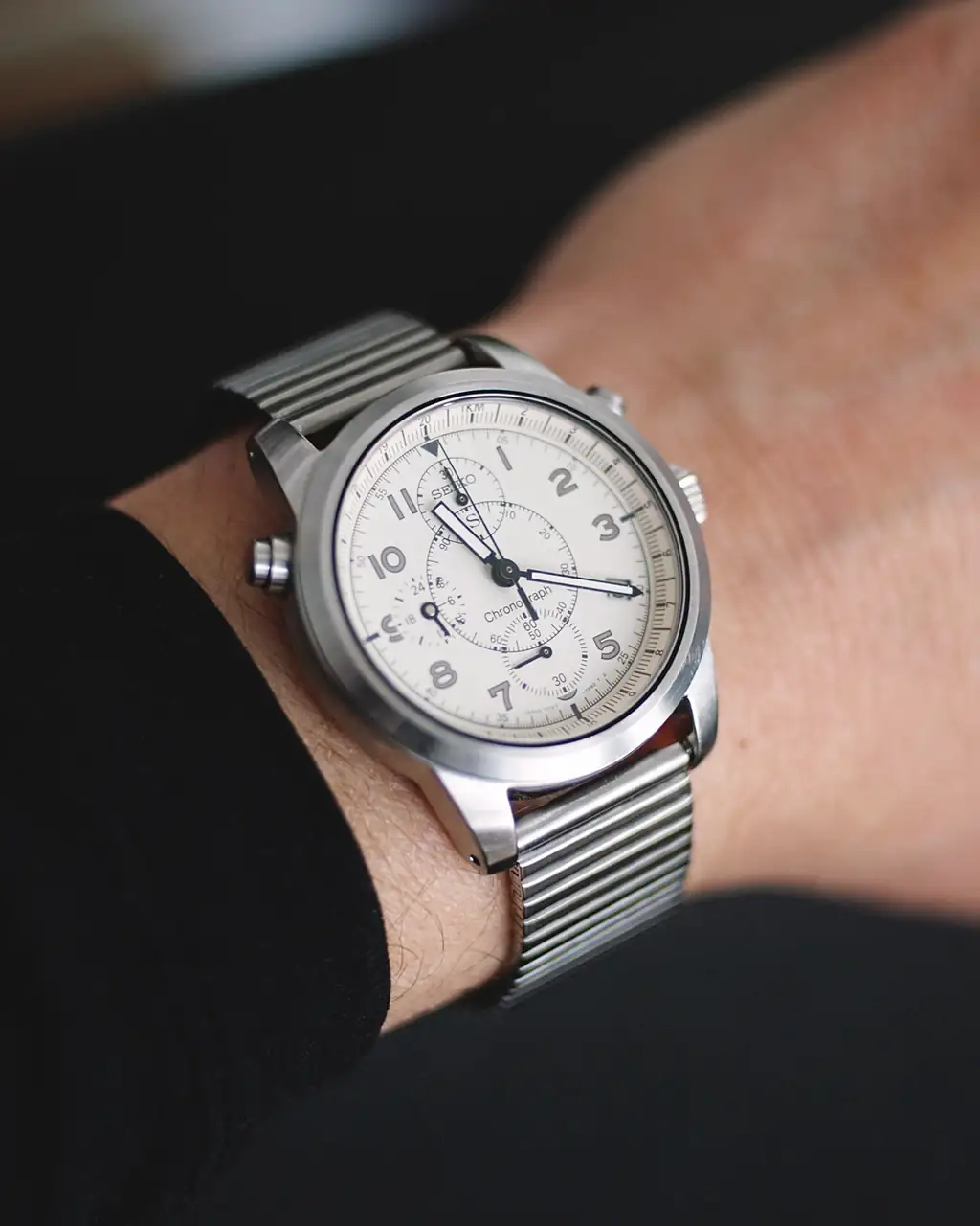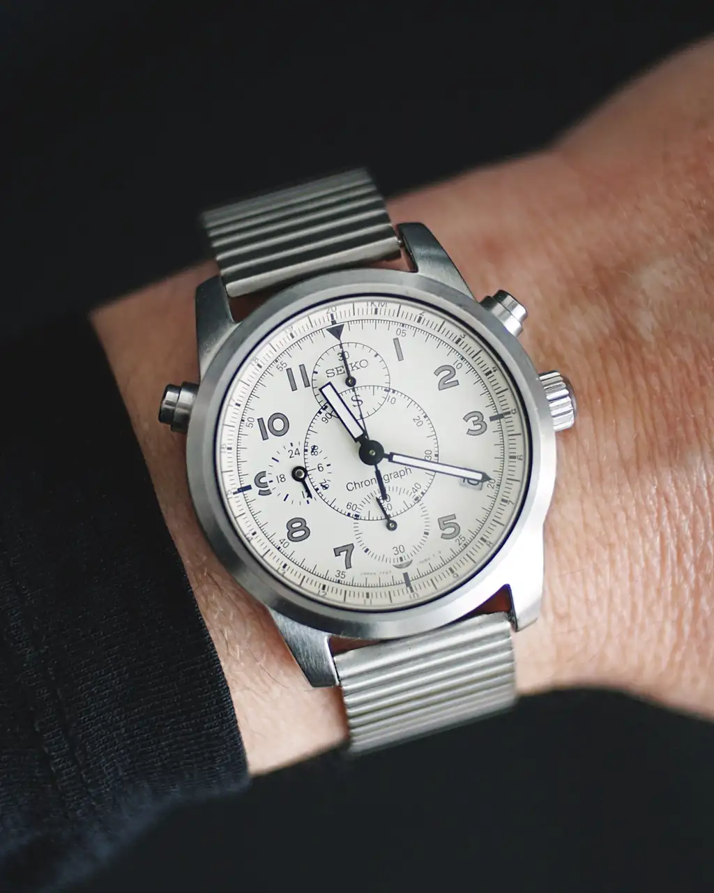 Hoy estreno crono Seiko de 36mm! No conocía este modelo hasta que lo encontré por ebay! Es de 1995. Me ha llegado hoy, me gusta mucho su dial estilo militar, su sencilla caja con configuración de botones tipo bullhead y por supuesto su tamaño y proporciones. No suelo encontrar cronos de este tamaño.