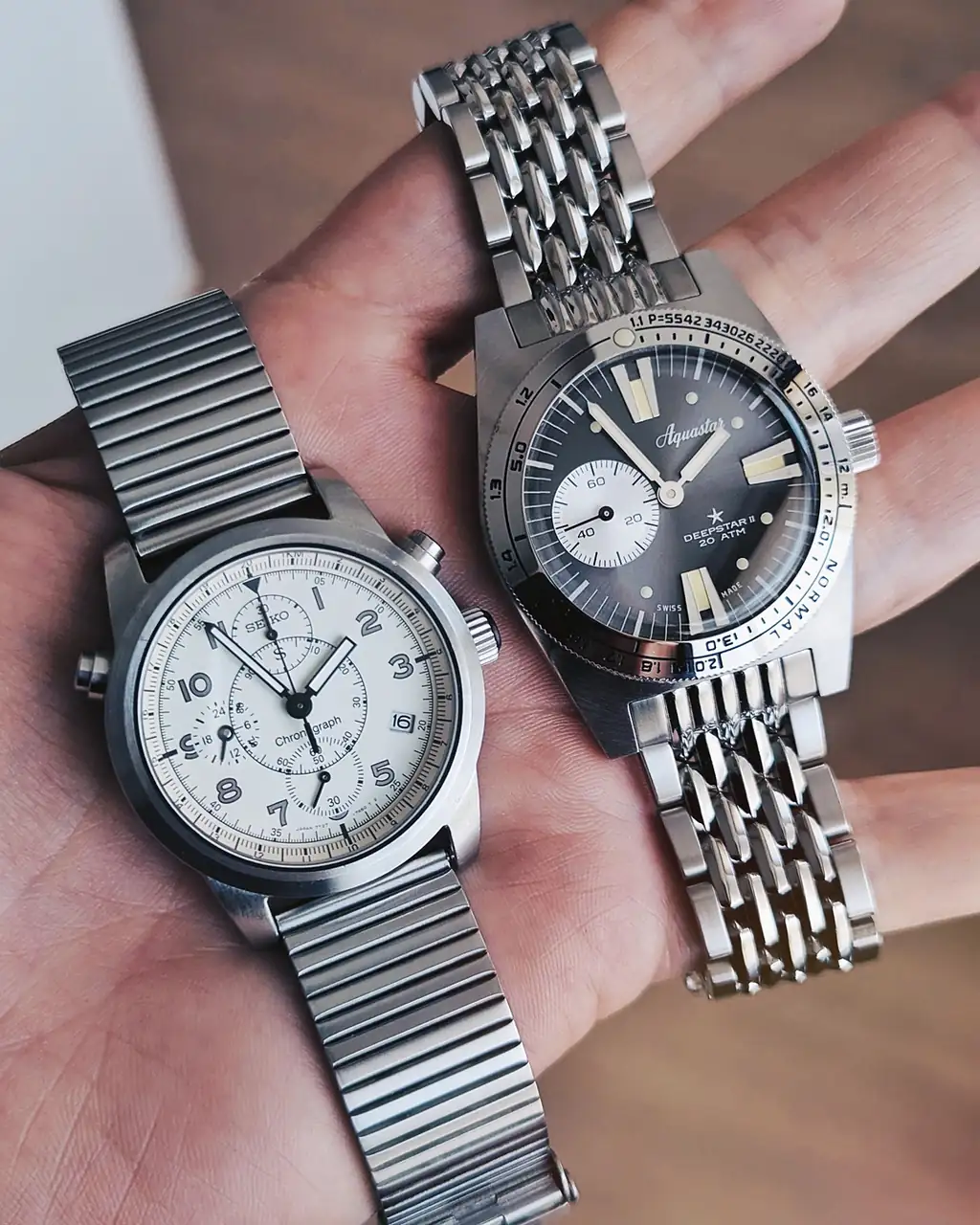Me gusta más con la milanesa. Pero ambas le quedan bastante bien.👌🏻Sigo probándole opciones, éste brazalete de aliexpress que tenía por ahí olvidado no le queda mal, aunque creo que está decidido que lo llevaré con una milanesa cepillada de grosor medio, ni muy fina ni muy gruesa.
