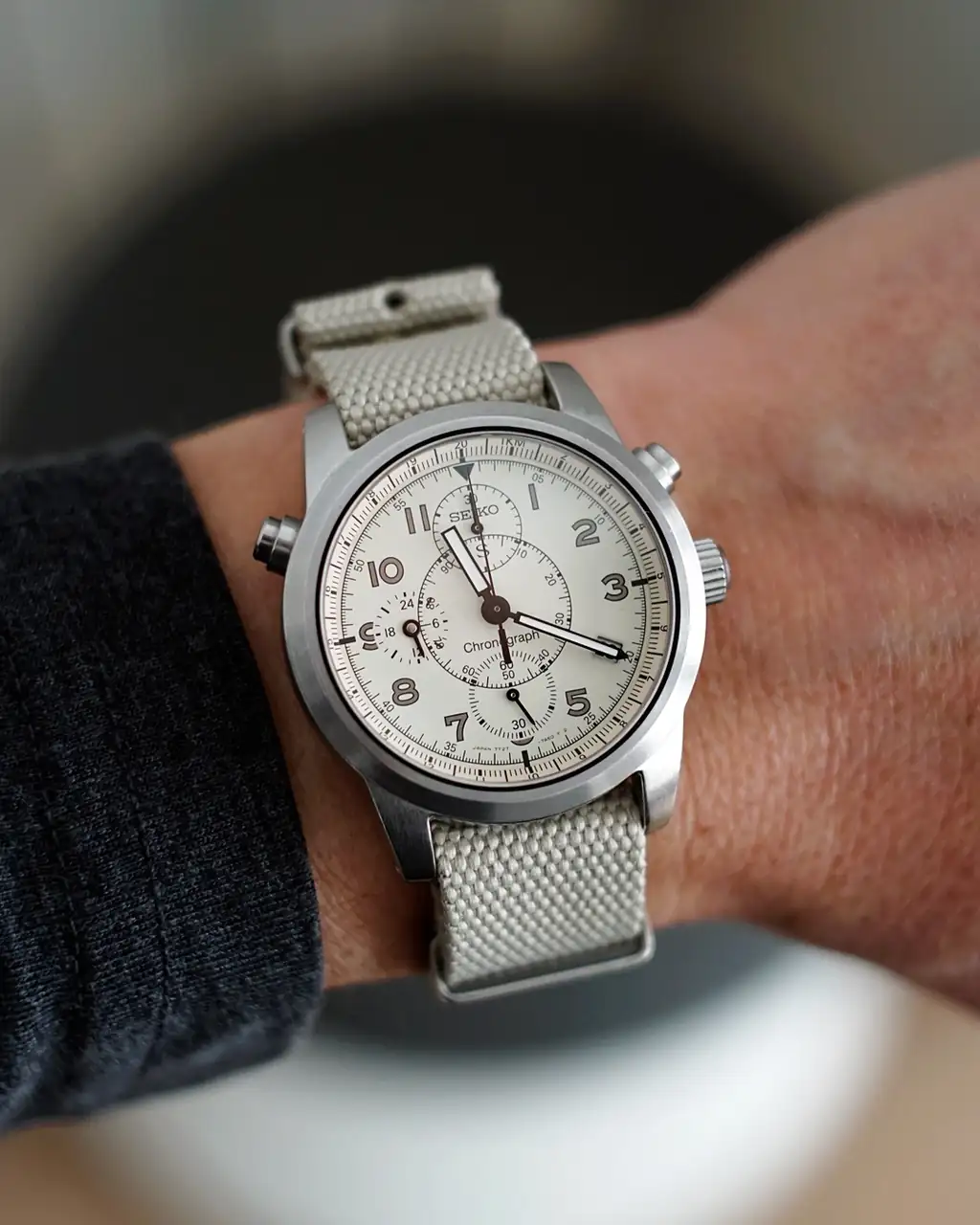 La nato le queda muy bien. Parece de algodón, como las AF0210.Sigo probándole correas al Seiko SUS, aunque luego acabo llevándolo con metal