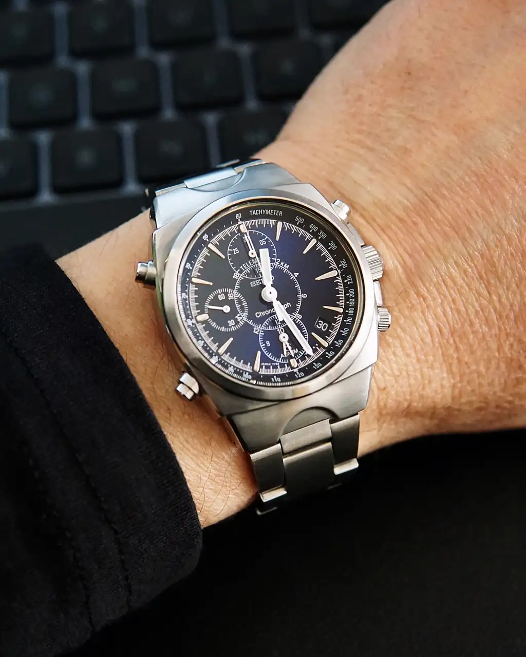 Es un modelo de 1999 creo, dial muy parecido pero con otro movimiento, esta vez con alarma, por lo que ya no tiene la disposición de los pulsadores tipo "bullhead". La caja tiene el mismo tamañode 36mm, aunque con el guarda coronas llega a 37mm.
