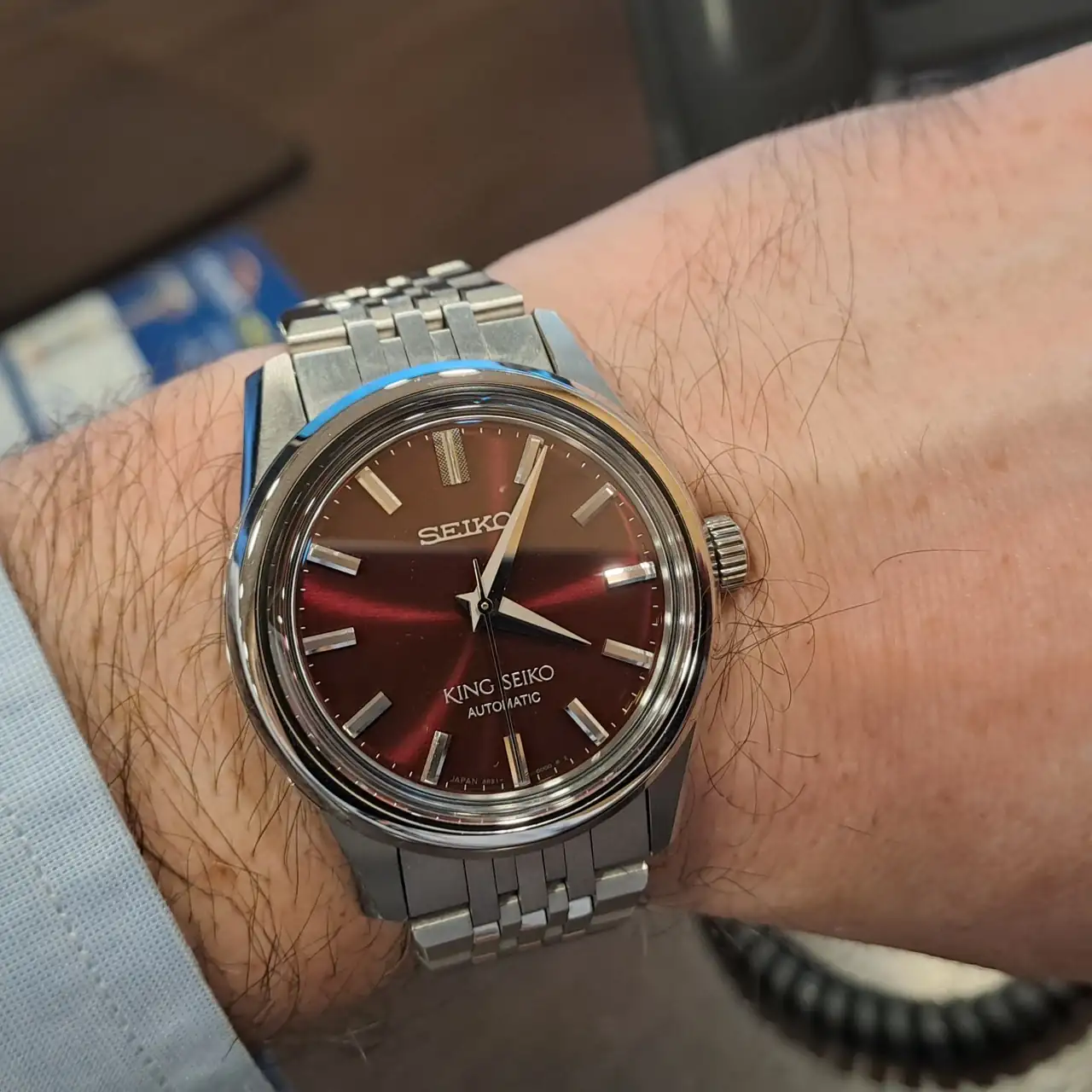 Me gusta mucho esta primera versión de los nuevos KingSeiko en 37mm. Éste granate y el plateado con cepillado vertical eran mis preferidos.
