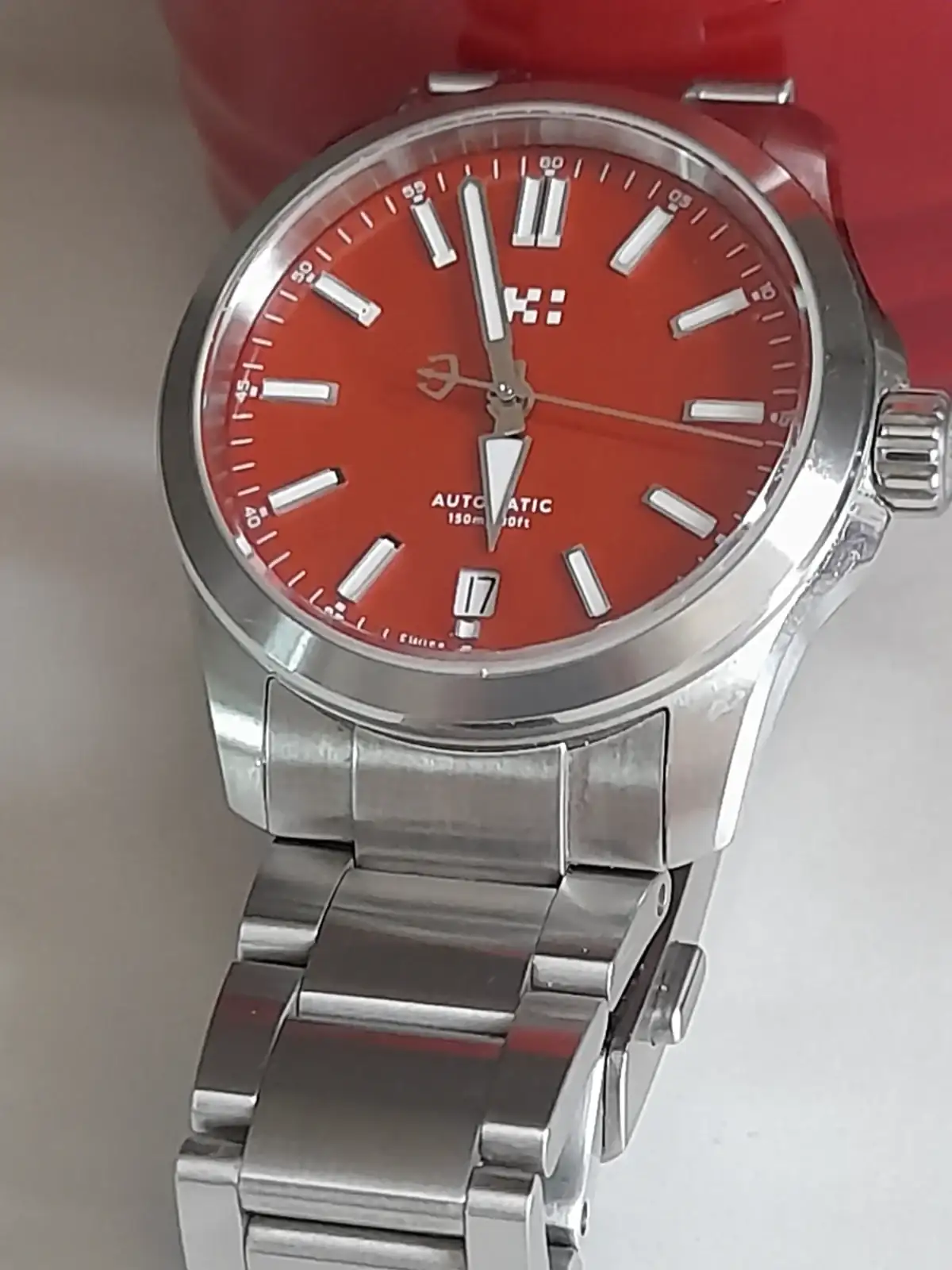 Te queda muy bien. Hay que admitir que está óptimamente compensado con respecto a su tamaño (¿34 mm?) debido a esos índices "bastones" cortos y montados en el exterior de la esfera.