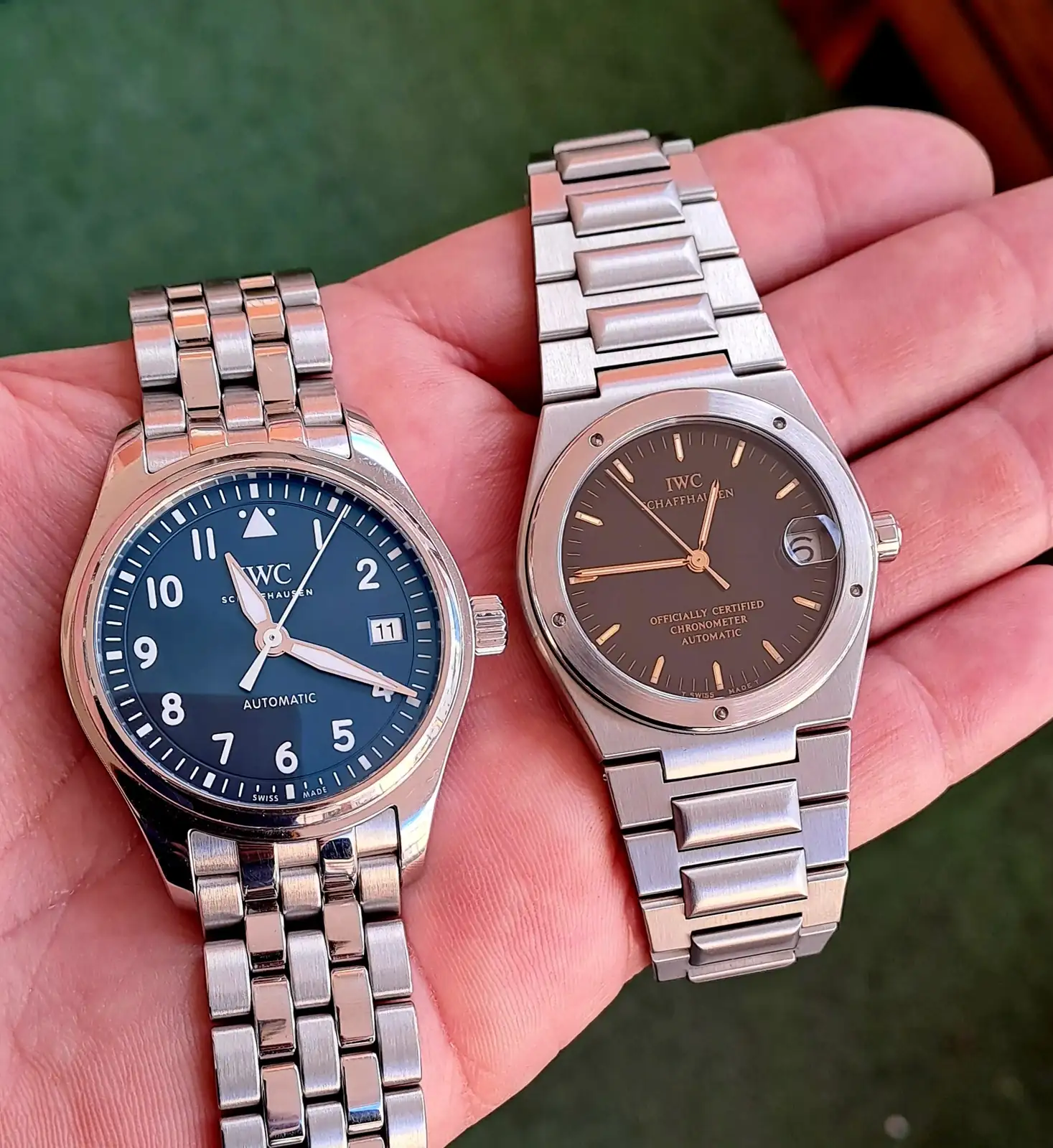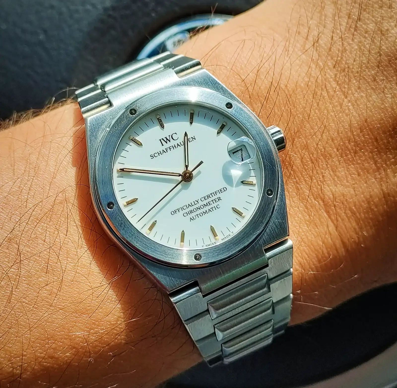 Efectivamente. Esta referencia, la 3521, es un tanto especial, por varios motivos. Iwc, en los años 90, quiso dar un golpe en la mesa con respecto a los modelos deportivos de acero, orientados al reloj herramienta.Te queda muy bien. Hay que admitir que está óptimamente compensado con respecto a su tamaño (¿34 mm?) debido a esos índices "bastones" cortos y montados en el exterior de la esfera.