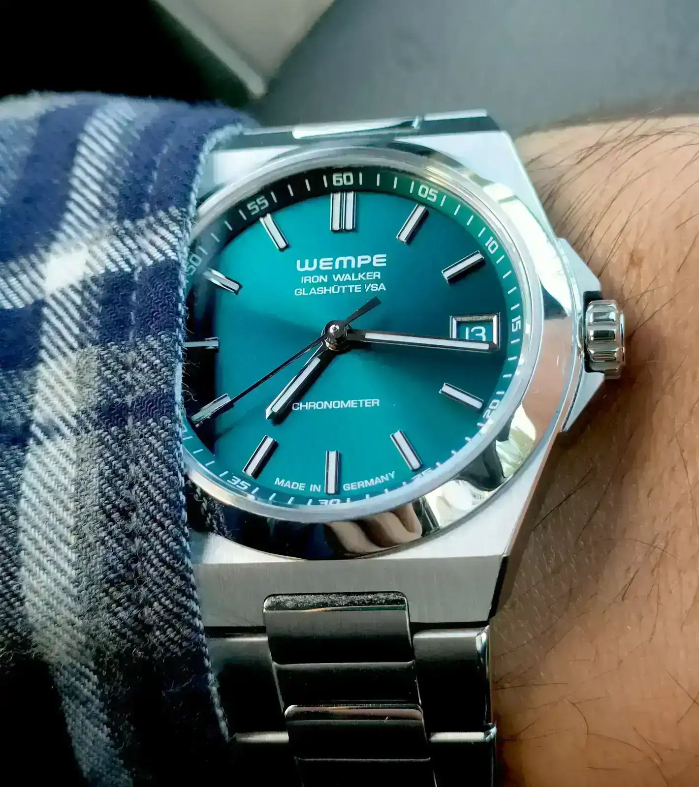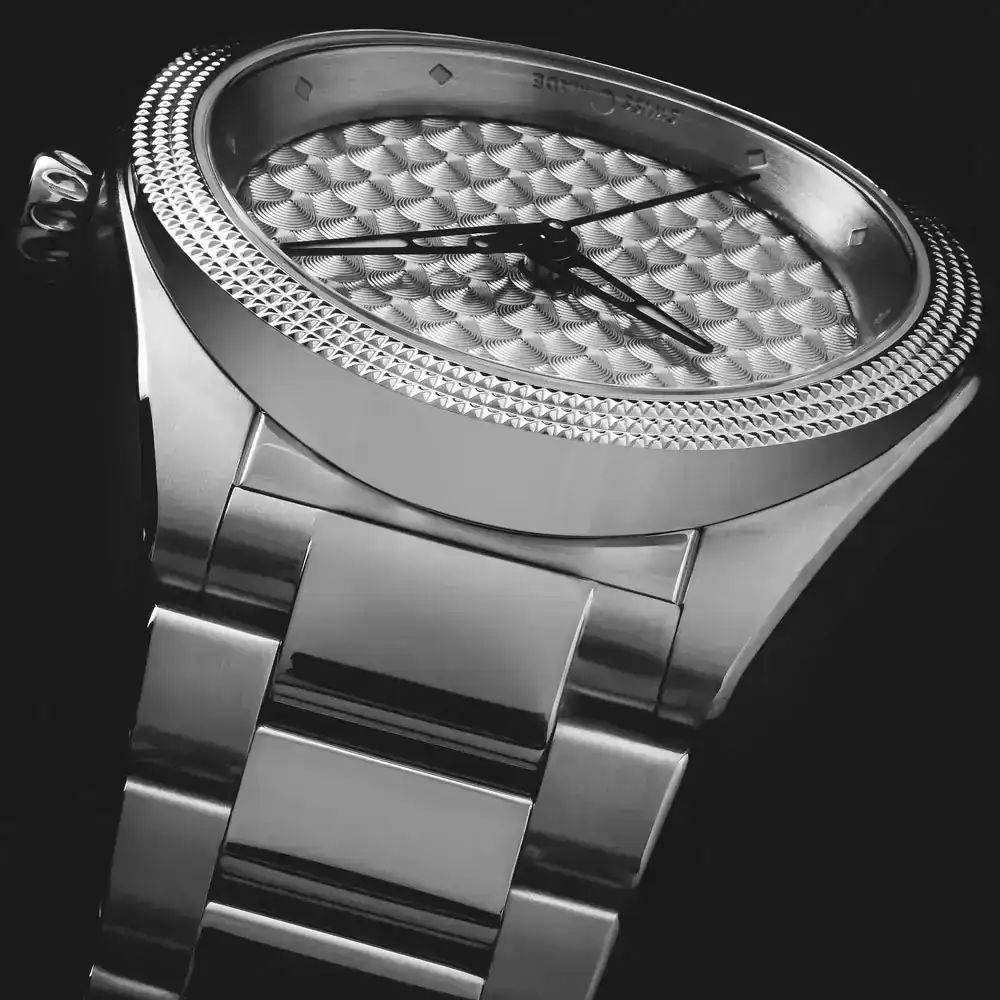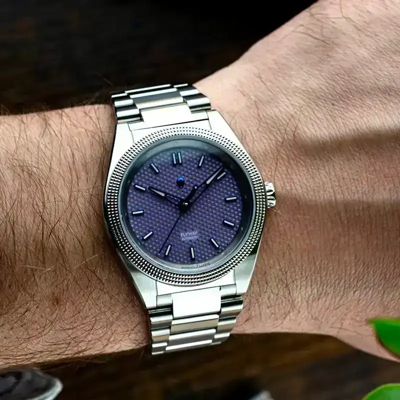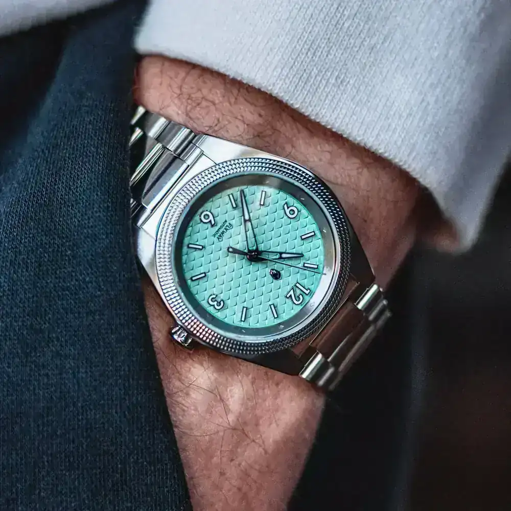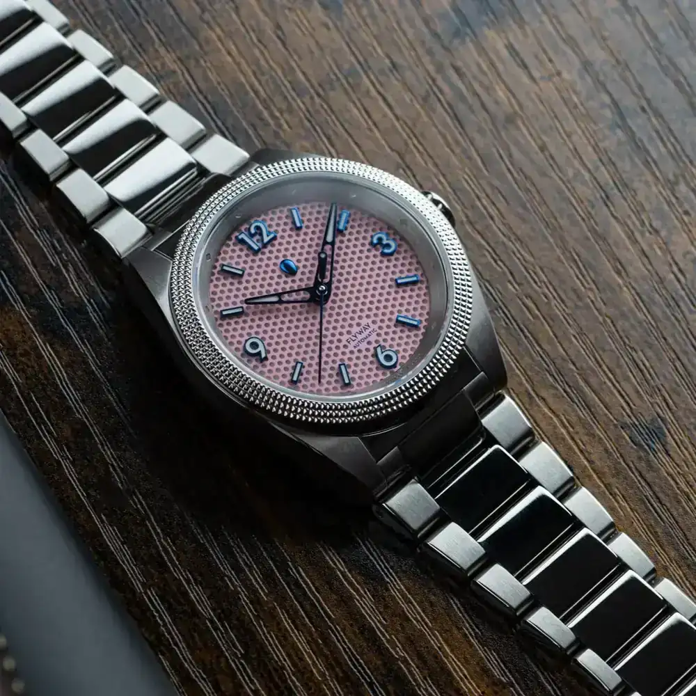A mí también me ha parecido muy chula esa esfera gris semi-lino de índices arábigos, la corona cebolla y el logo alado azul.