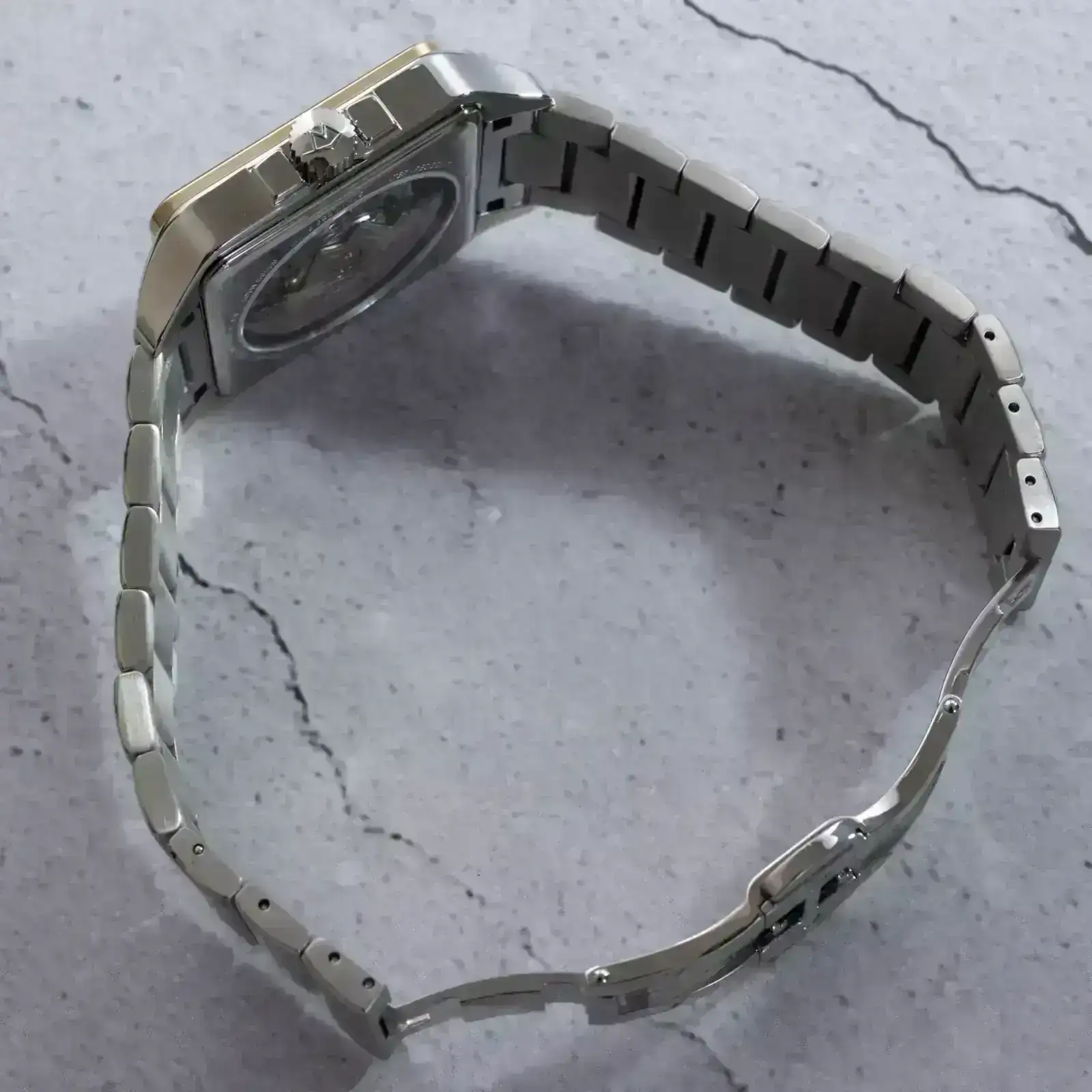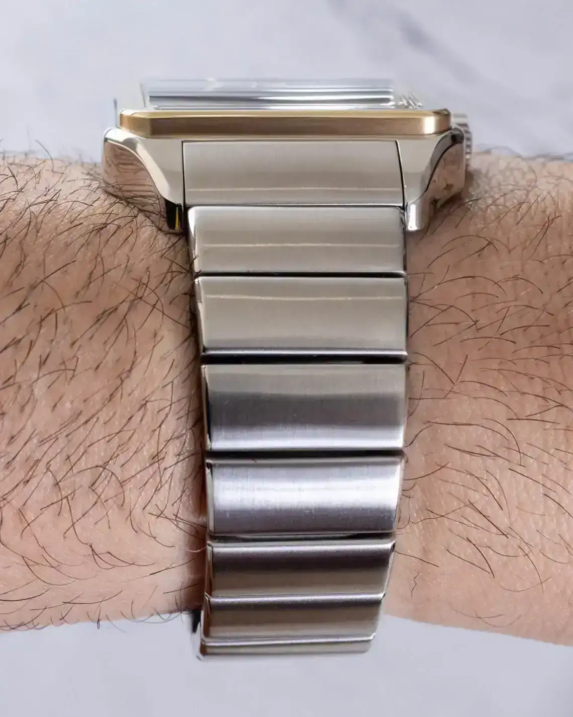 Me gusta esa contundencia en muñeca. Al ser de 35mm y cuadrado, no lo veo desproporcionado.Con ese diámetro y la altura que se percibe, va a tener presencia en la muñeca (lo cual no sé si es positivo en este tipo de reloj) como puede apreciarse en su versión mixta.