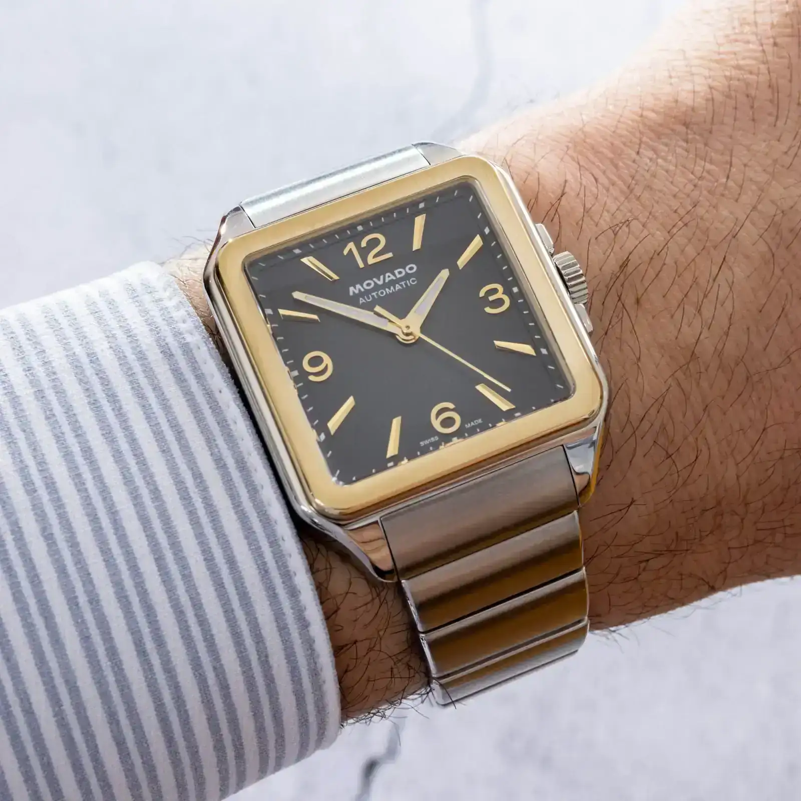 El negro con esa correa marrón, me parece una delicia.MOVADO tiene en su catálogo al cuadrado Heritage 1917 de 35mm de diámetro y 45mm de L2L, con movimiento automático y pvp desde 1395€.