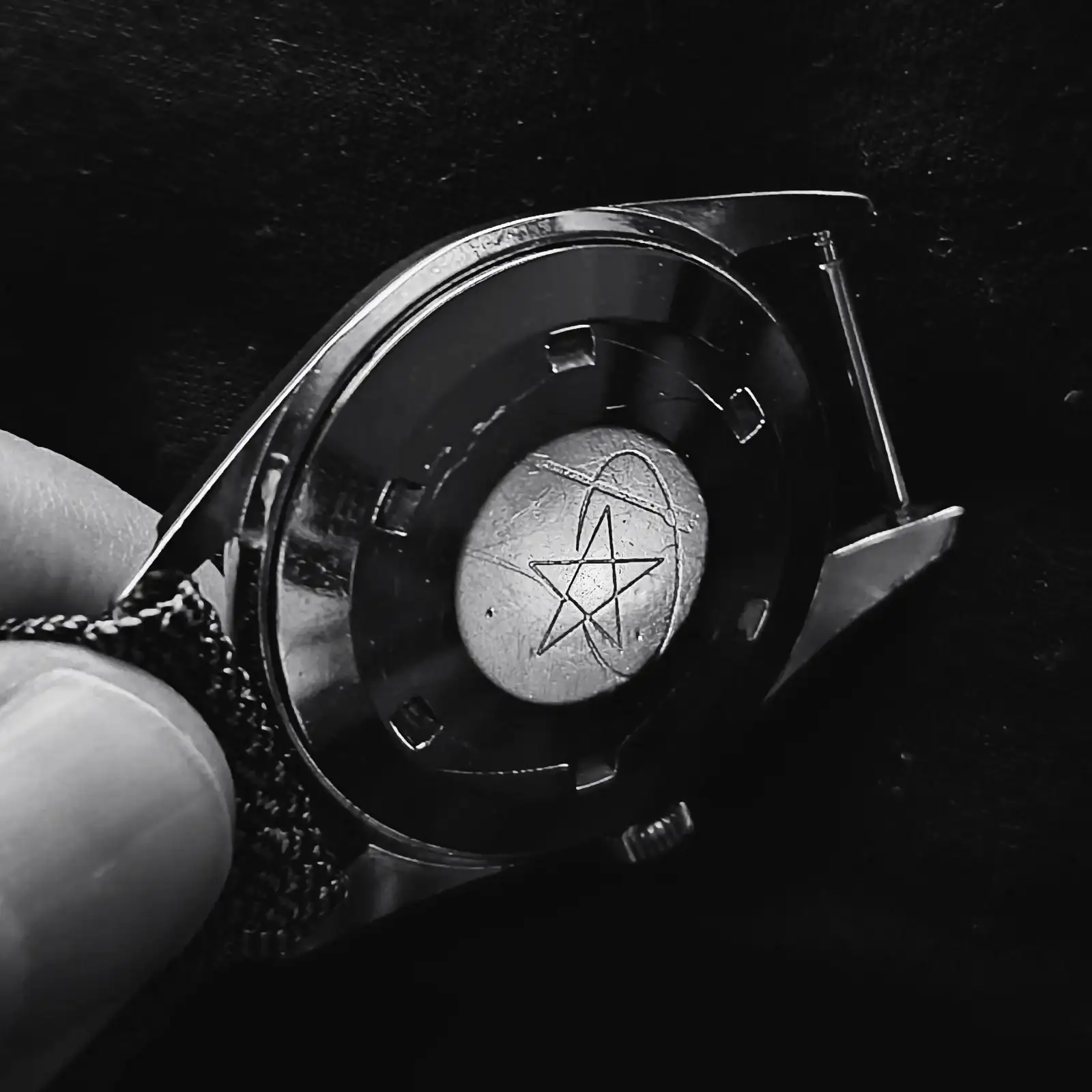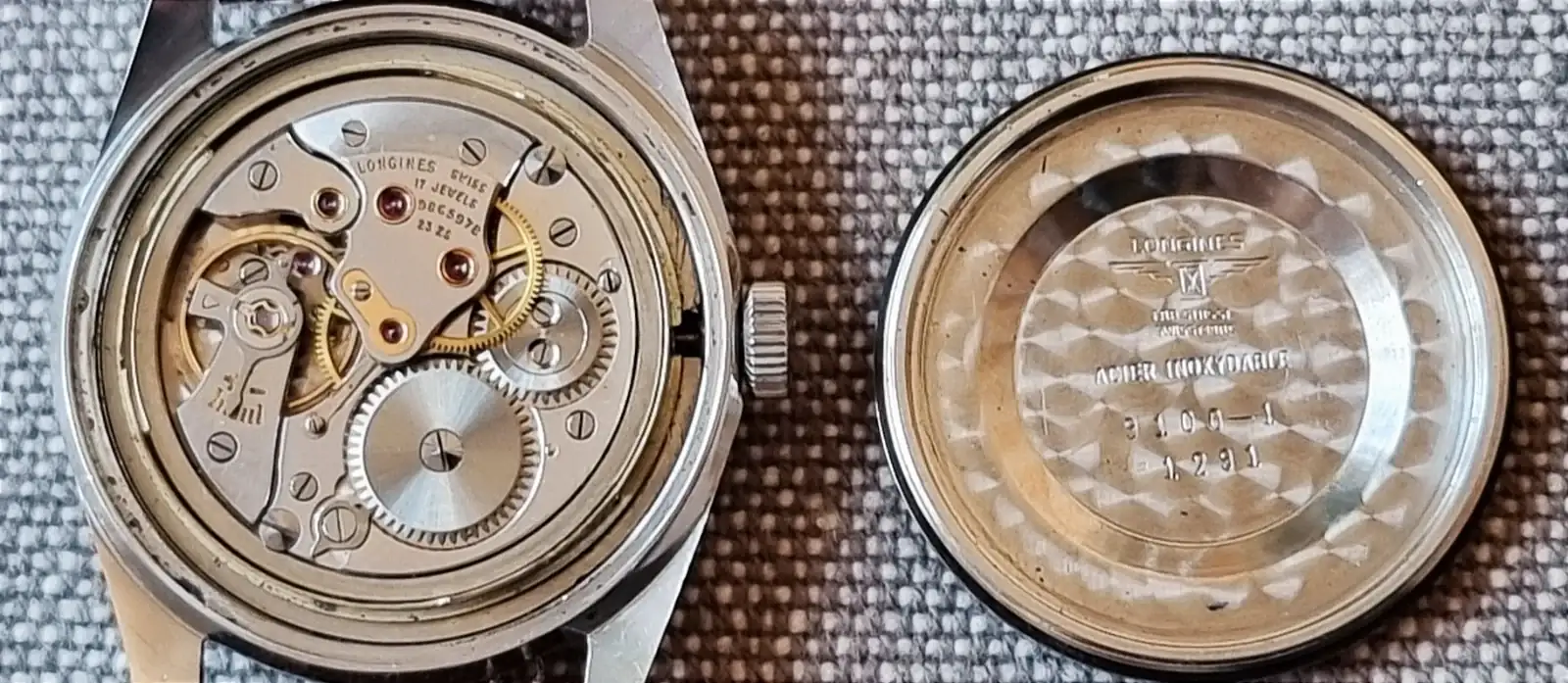 Sobre la trasera, lo cierto es que no es muy vistosa, aunque a mí me gusta. El grabado representa un pentáculo, una flecha y una especie de órbita. También pone Longines y "waterproof", aunque en la foto, con la luz de lámpara que tengo ahora, no se aprecien las palabras:
